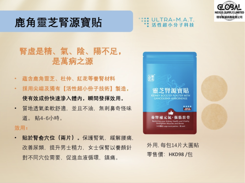 採用尖端科技及極品級靈芝製造,發揮前所未有的快速滲透功能,有助紓緩腰痛,保護腎氣,從而提升整體健康。