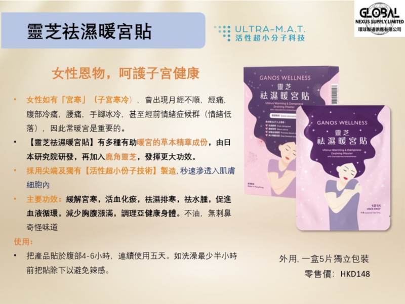 • 【靈芝祛濕暖宮貼】有多種有助暖宮的草本精華成份,由日本研究院研發,再加入鹿角靈芝,發揮更大功效。