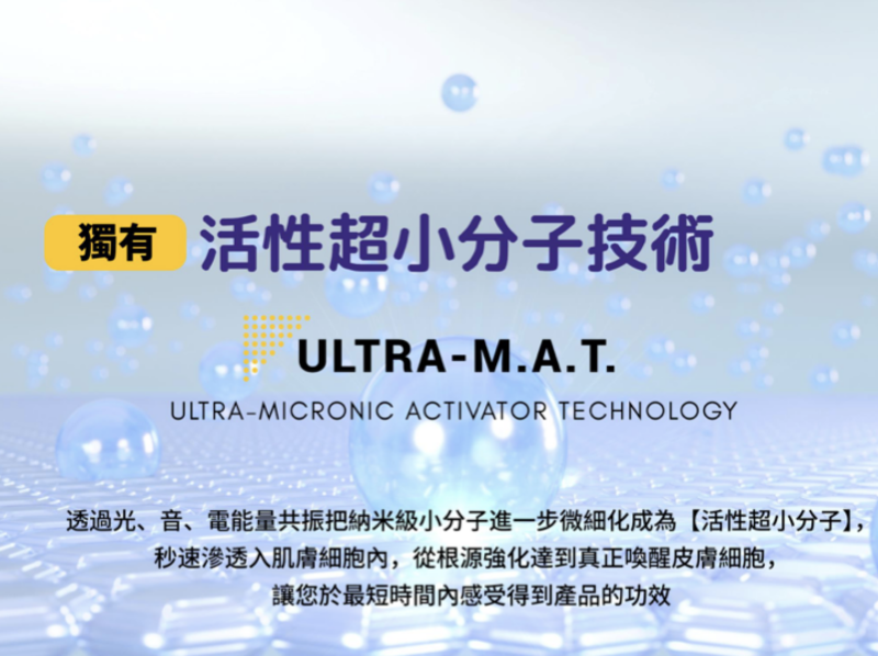 騰泰堂採用獨有的「活性小分子科技」,透過光、音、電能量共振把納米級小份子進一步微細化成為【活性超小分子】,秒速滲透入肌膚細胞內,從根源強化達到真正喚醒皮膚細胞,讓您於最短時間內感受得到產品的功效