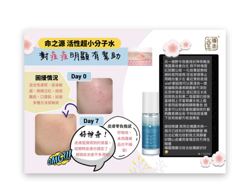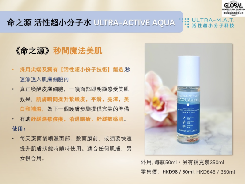 《命之源》活性超小分子水能真正喚醒皮膚細胞,一噴面部即明顯感受美肌效果,肌膚瞬間提升緊緻度,平滑,亮澤,美白和保濕,為下一個護膚步驟提供完美的準備,滲透更佳。《命之源》亦為敏感性皮膚帶來新希望,抗敏防敏。