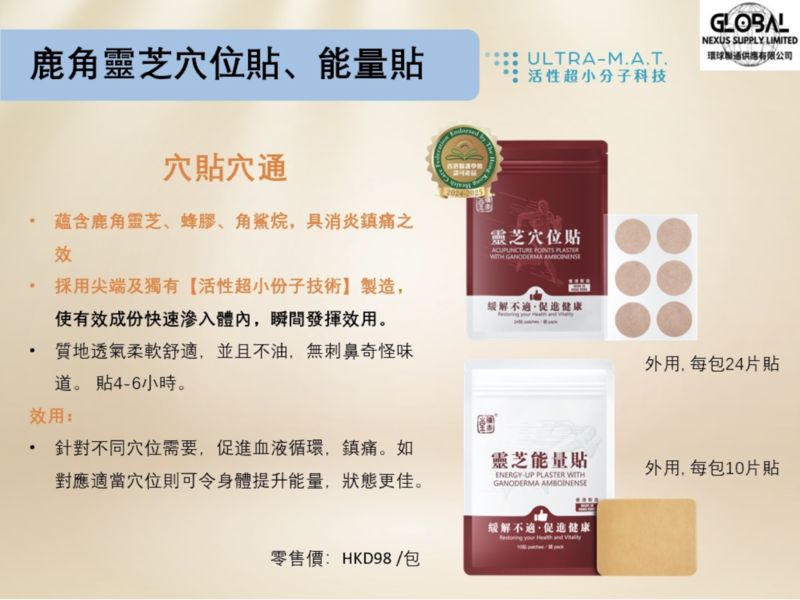 蘊含鹿角靈芝、蜂膠、角鯊烷,具消炎鎮痛之效,採用尖端及獨有【活性超小份子技術】製造,使有效成份快速滲入體內,瞬間發揮效用。質地透氣柔軟舒適,並且不油,無刺鼻奇怪味道。 貼4-6小時。效用: 針對不同穴位需要,促進血液循環,鎮痛。如對應適當穴位則可令身體提升能量,狀態更佳