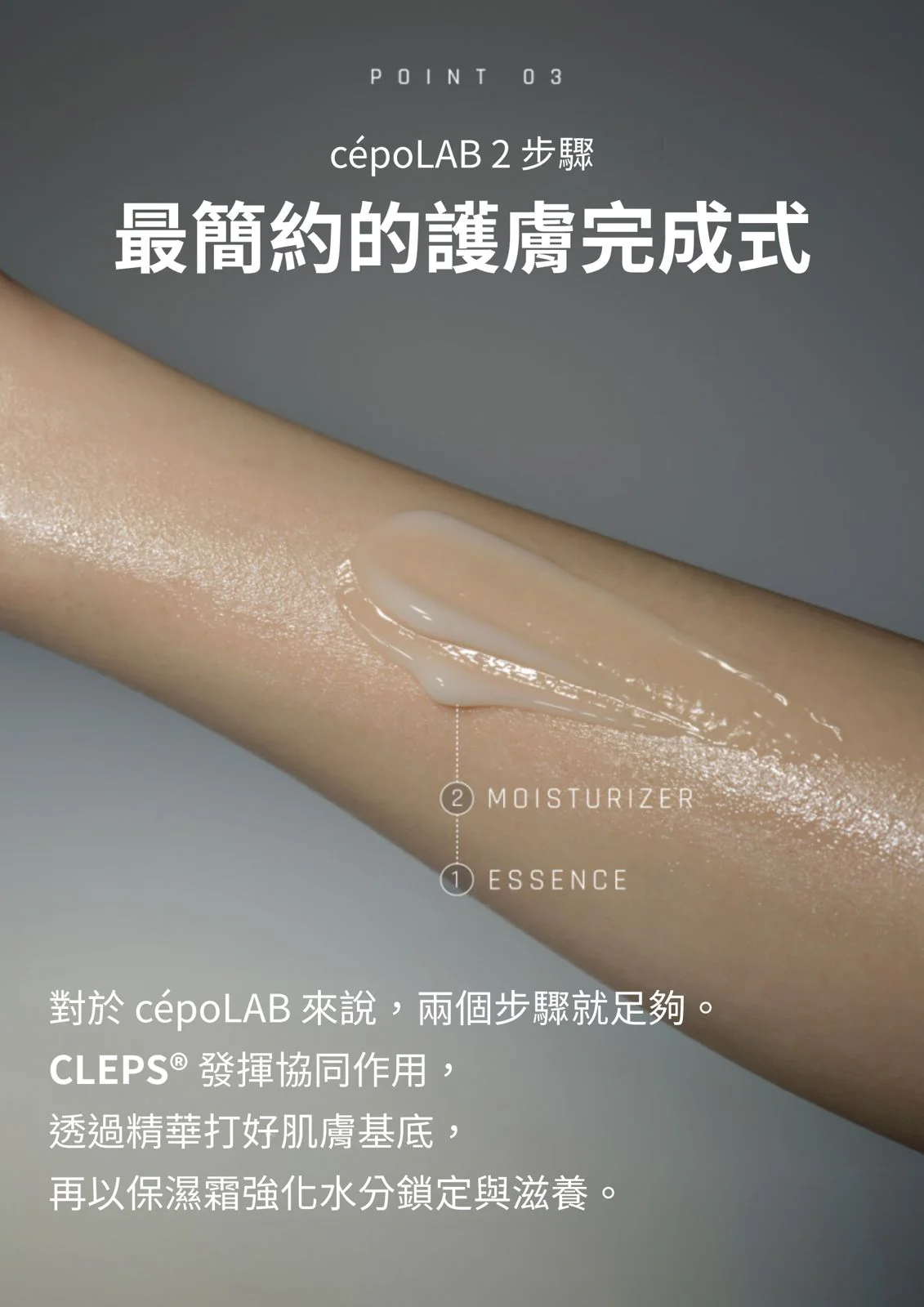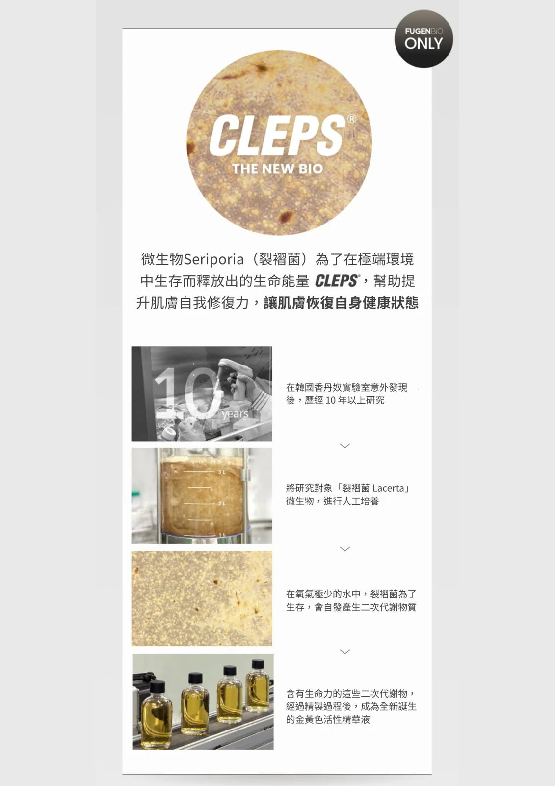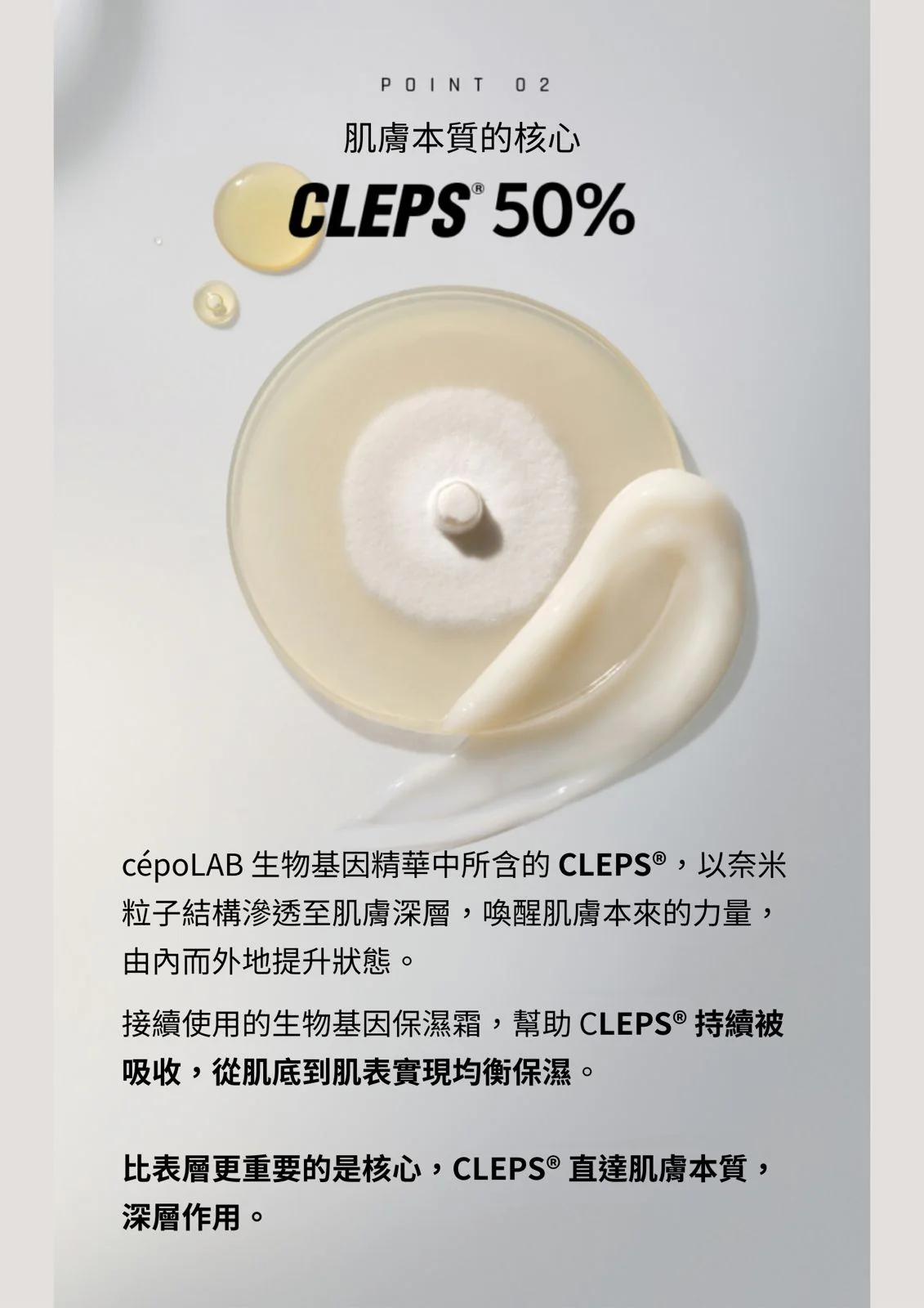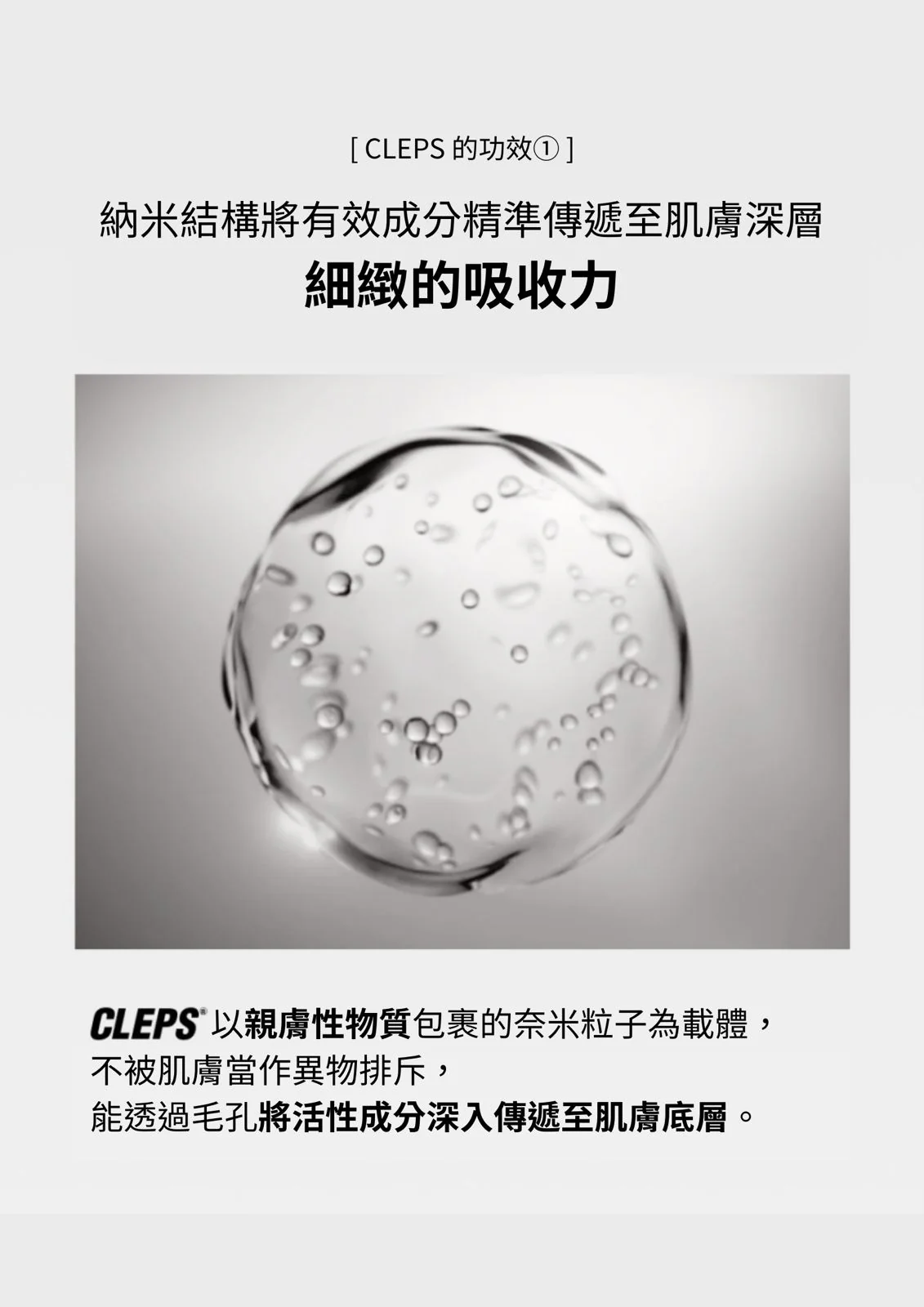 ✨50%CLEPS濃縮物:奈米粒子結構滲透至肌膚深層,提升活性吸收,並有強大的修復效果,減少皮膚老化因素,打造健康的肌膚基礎