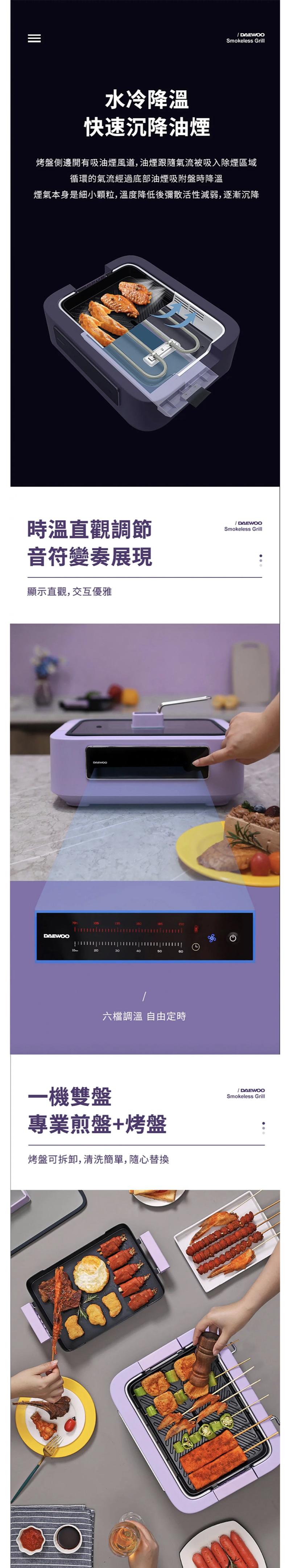 快速吸風抽煙, 側抽式水箱方便清洗,配備煎及烤兩個盤,一家人可安坐家中享受無煙燒烤樂趣。