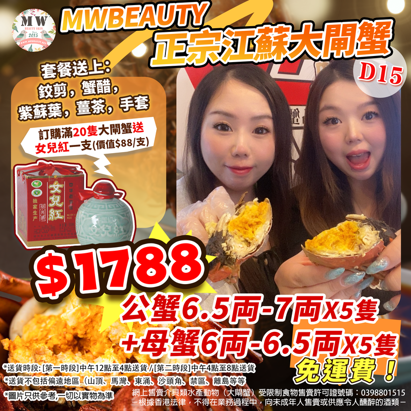 🔥訂購滿20隻大閘蟹送女兒紅一支價值$88/支 (只限單一訂單同一時間收貨地址) 🔥保證鮮活‼️有壞包換‼️