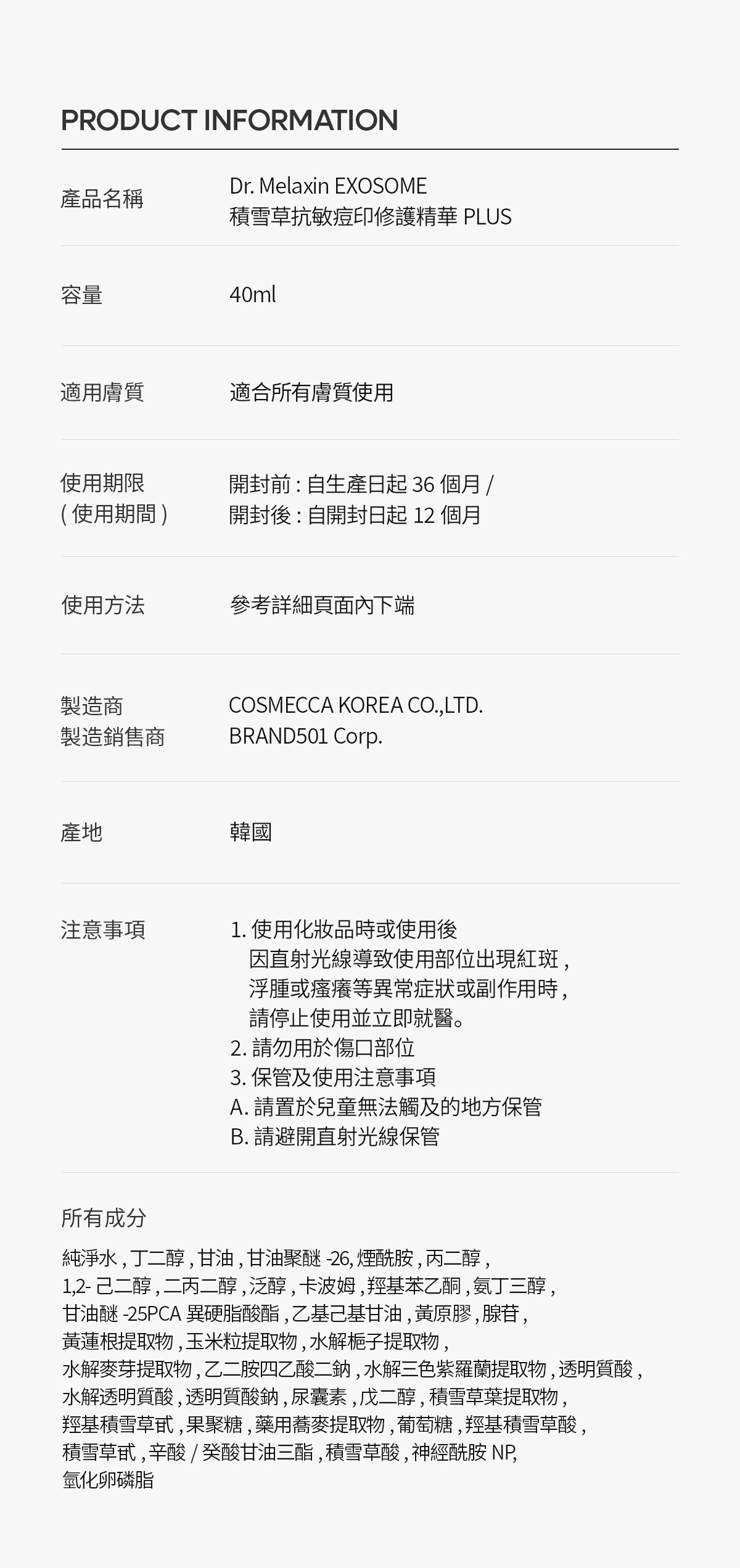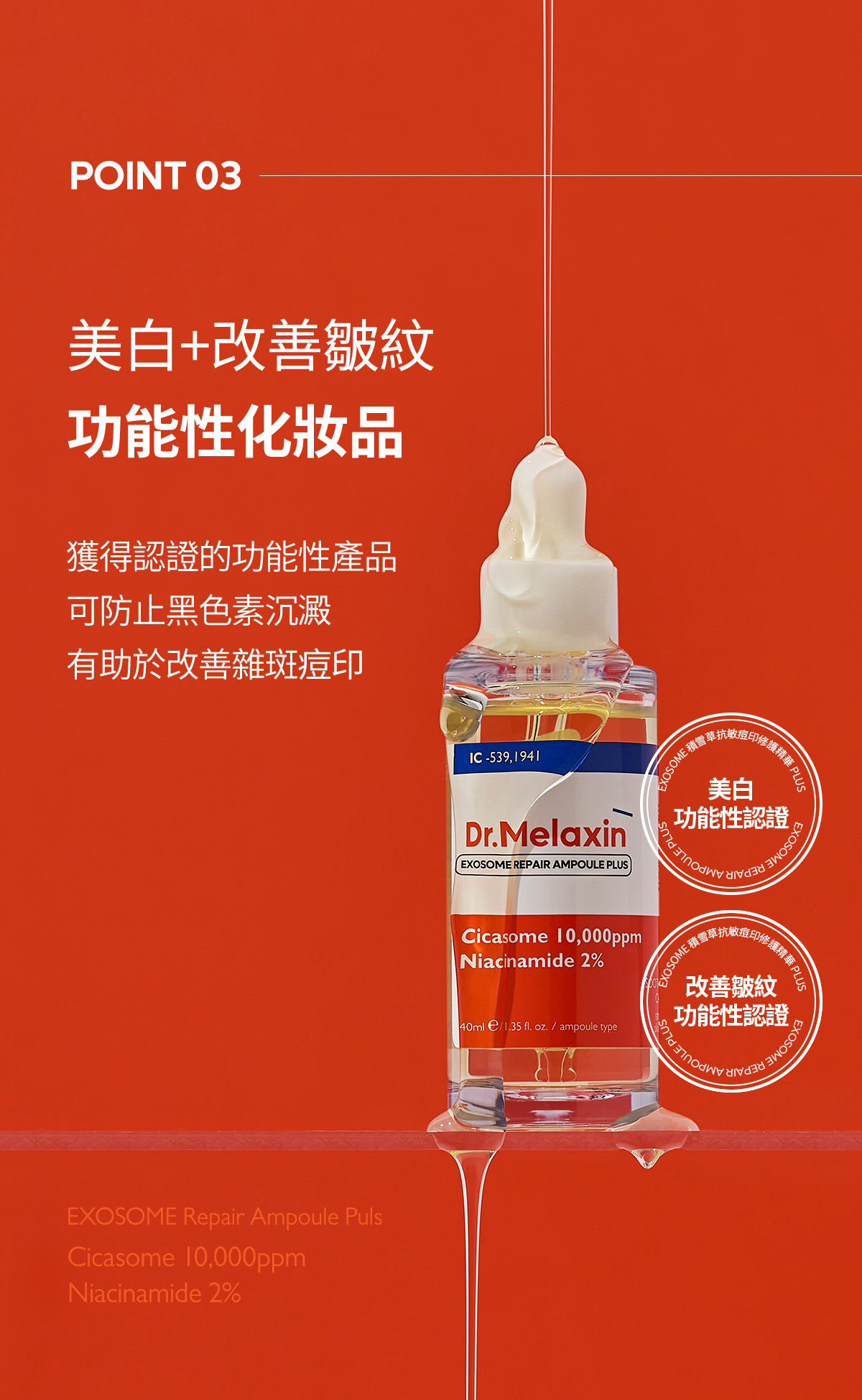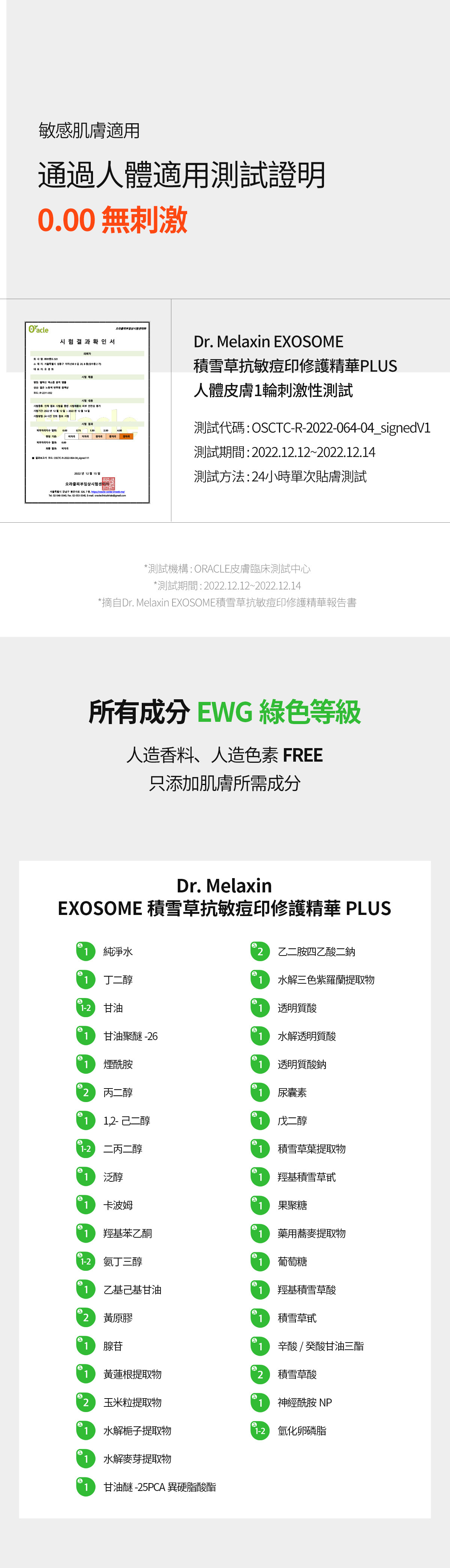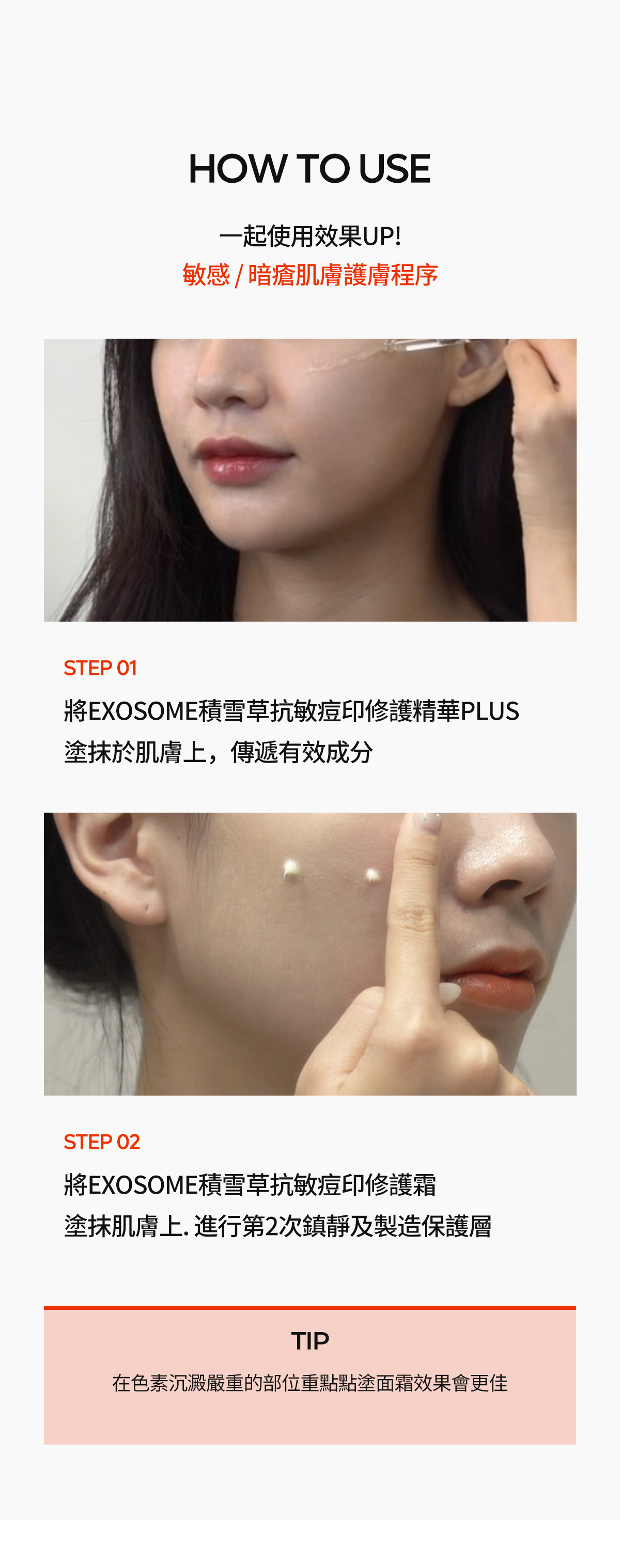 · 使用積雪草複合物EX成分, 護理痘印及色素沉澱