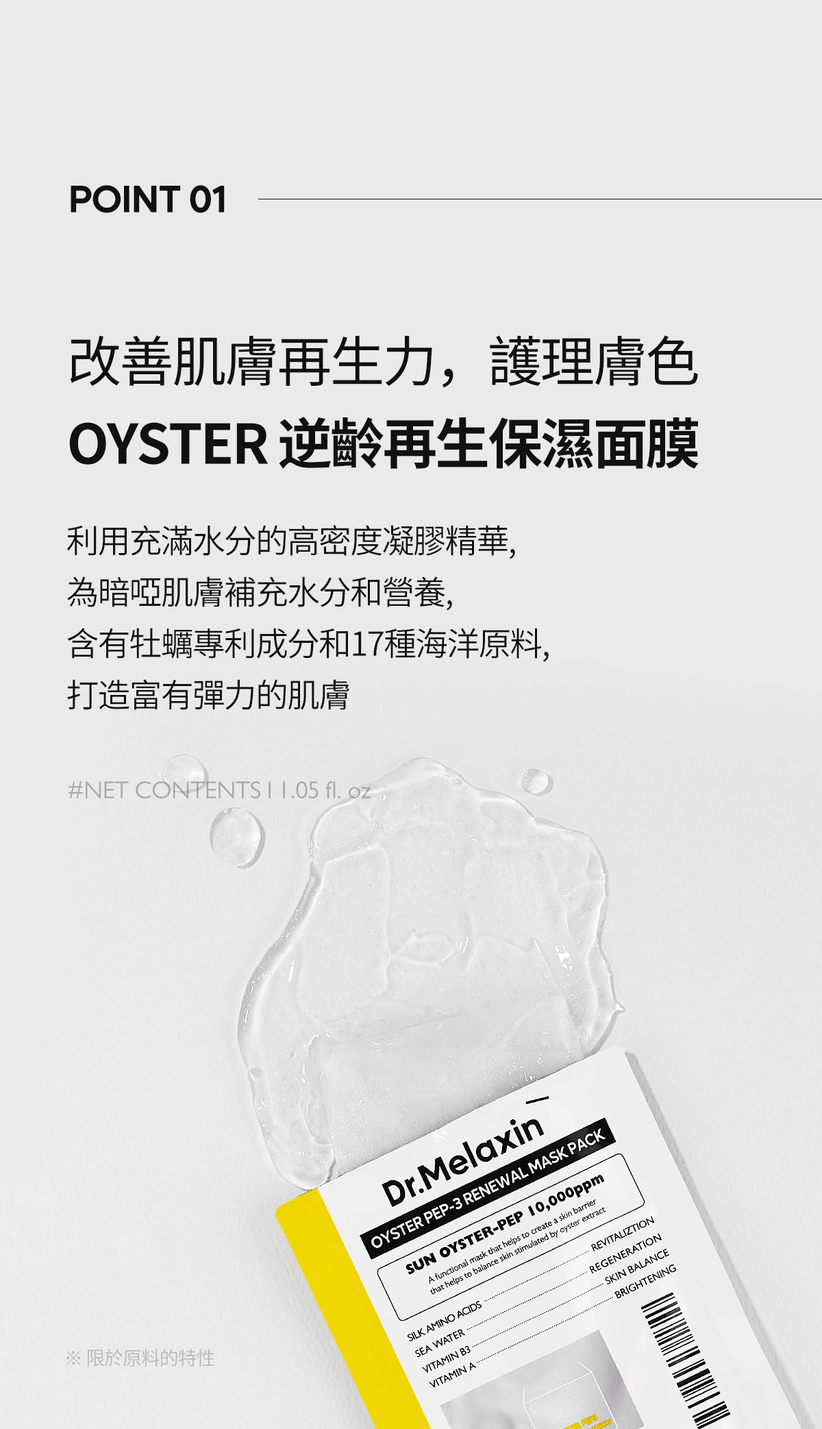 · 蘊含17種海洋原料壓縮的水分凝膠精華面膜