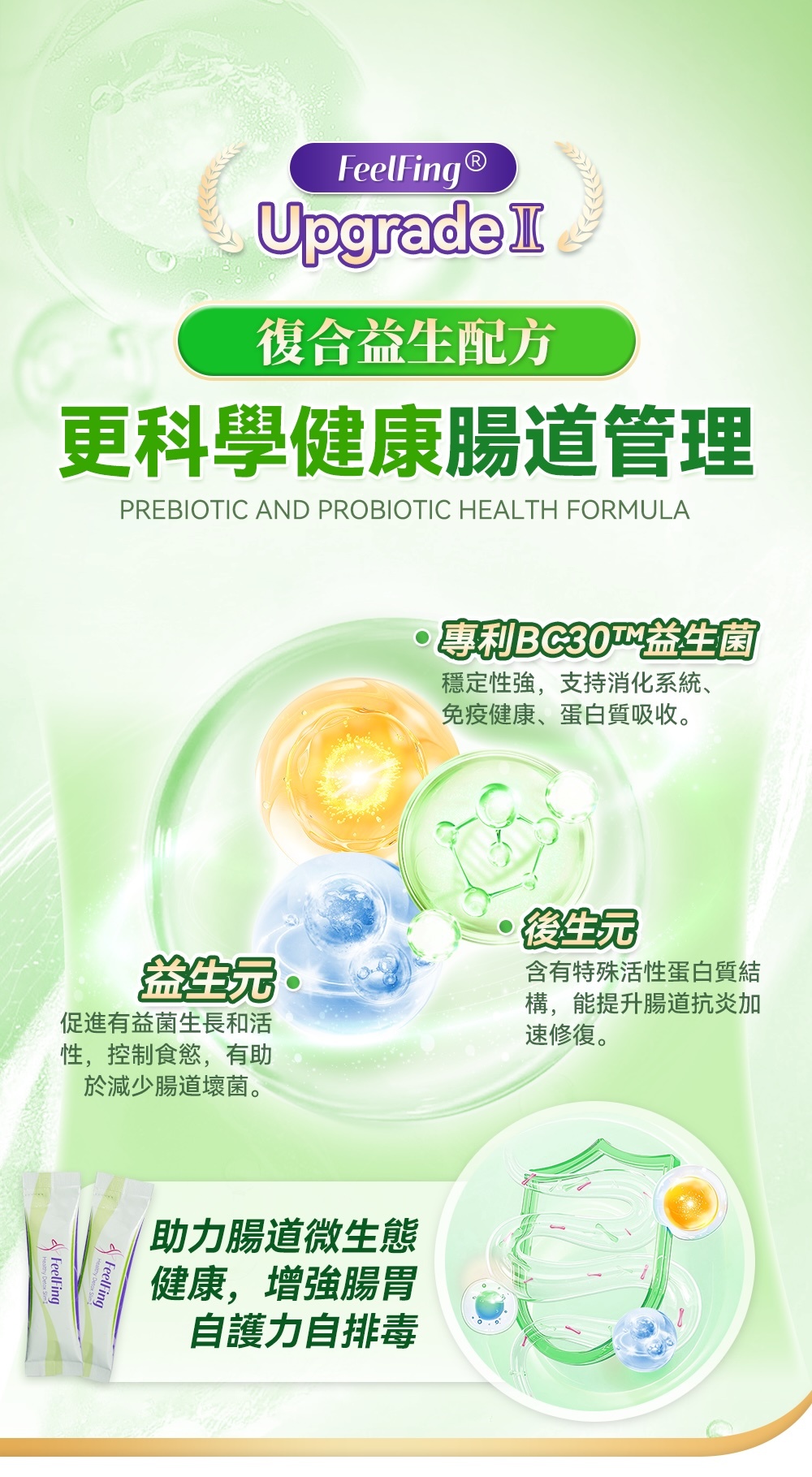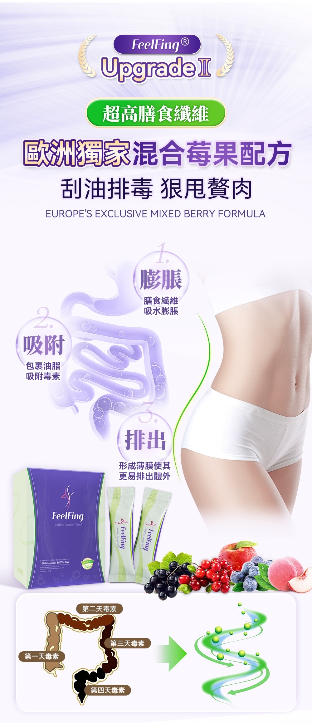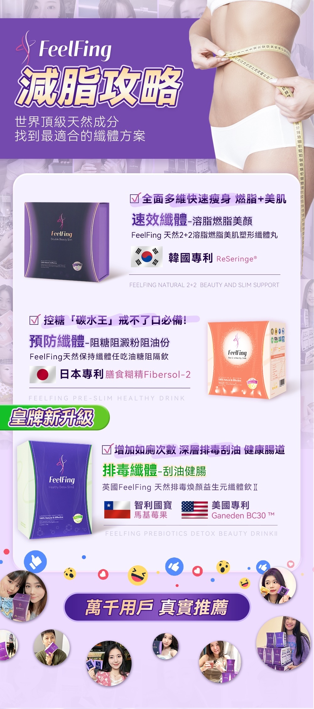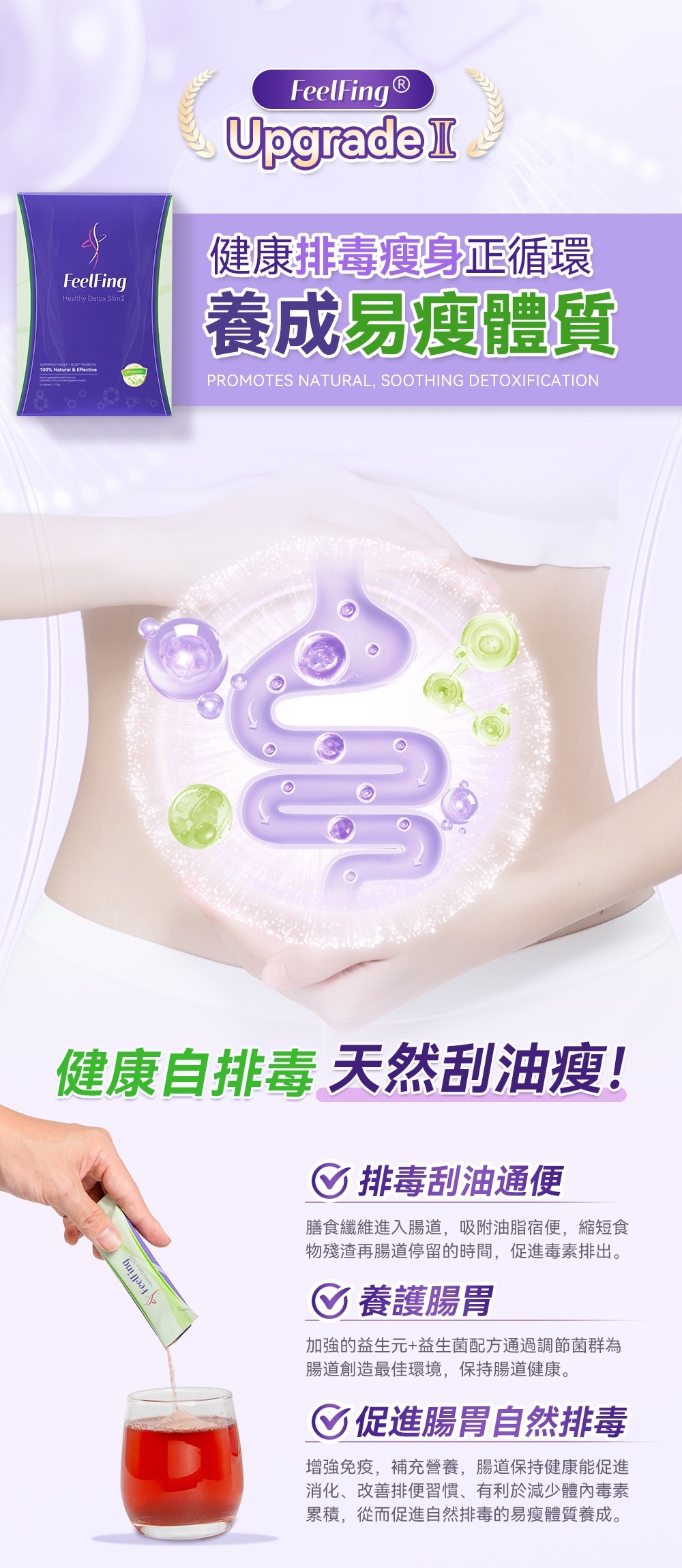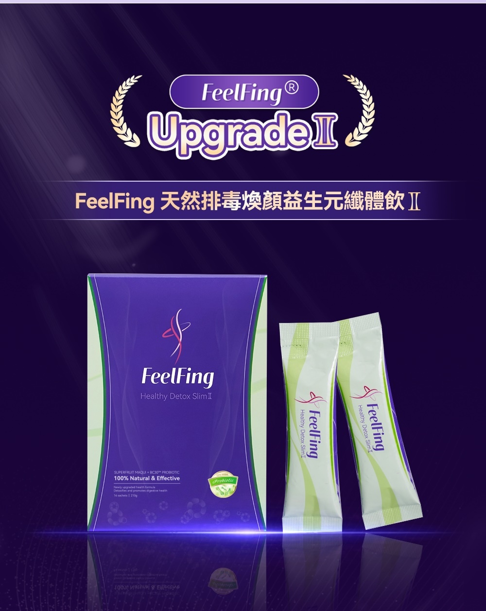 FeelFing皇牌刮油配方再升級「益生元纖體飲」,每日一杯落肚,邊排毒瘦身,邊健腸護胃!沿用一代有效成分,「復合莓果」有效排出體內的油脂和毒素,狠甩贅肉;「馬基莓」超強美顏抗氧化,天然口服的皮膚化妝品!重磅升級「復合益生元」配方,打造健康腸道,養成易瘦的體質,KO反彈!最佳健康搭檔「鐵蛋白+氨基酸」配方,保障我哋排便後的營養補充,免疫力提升plus!