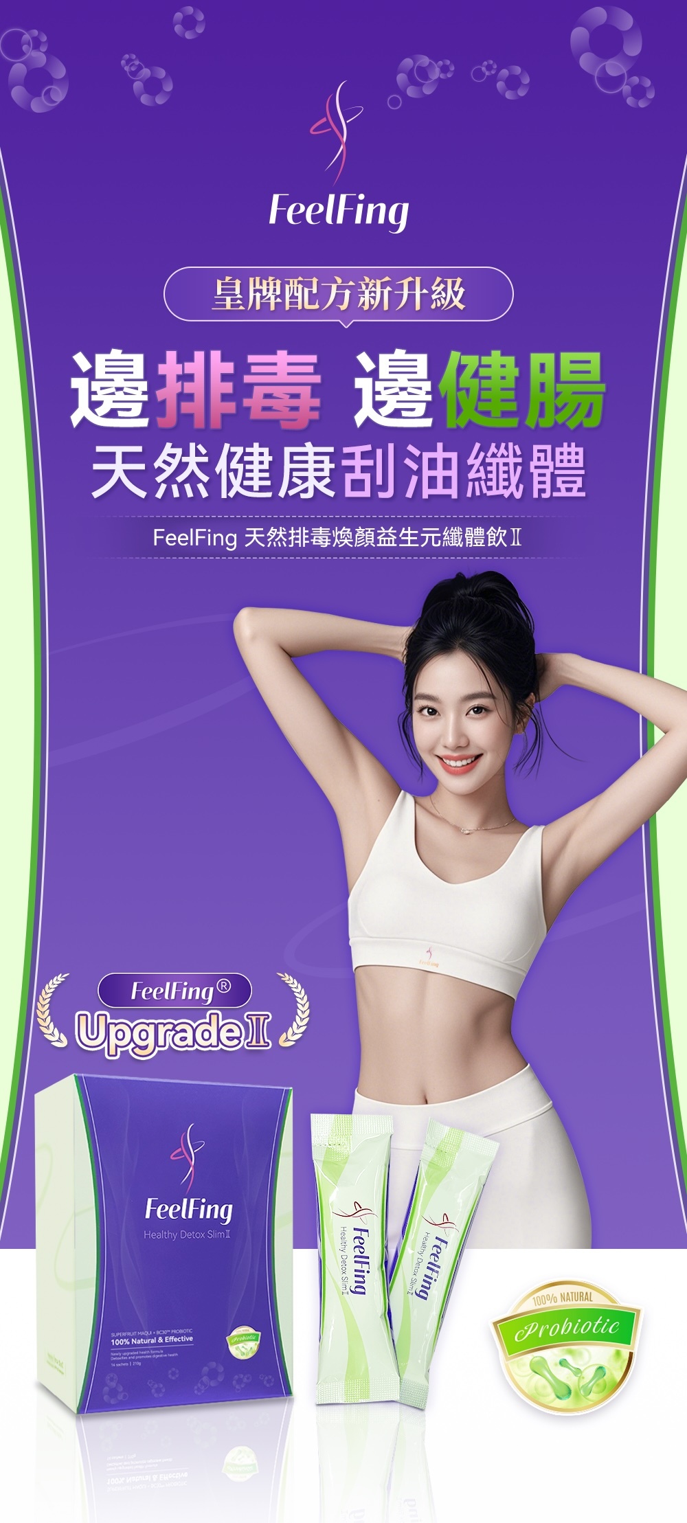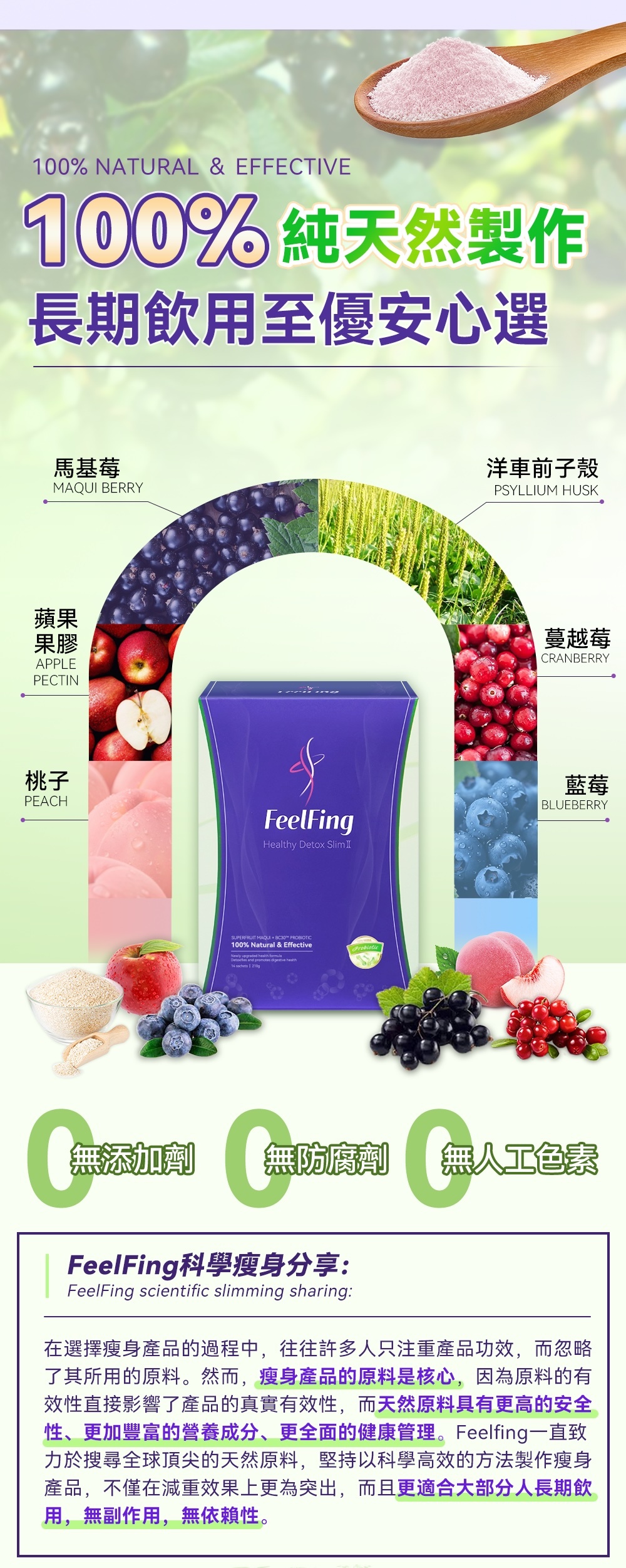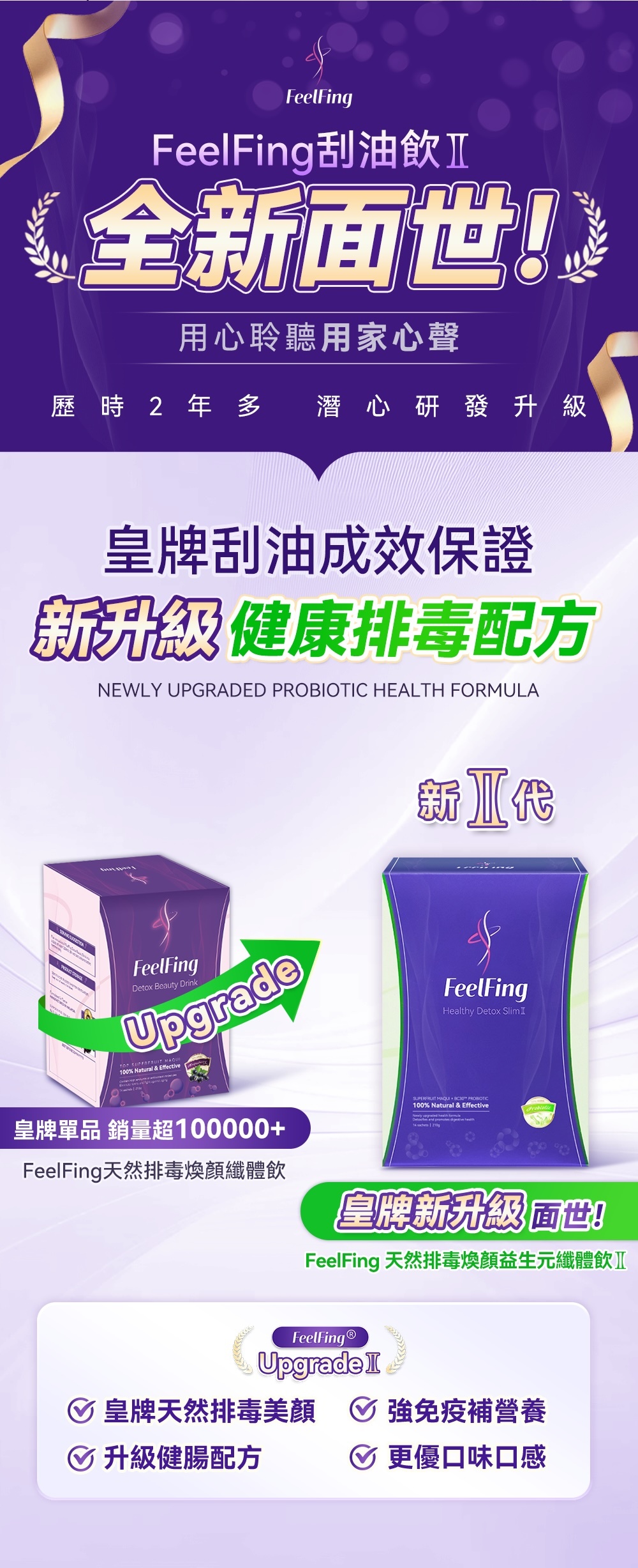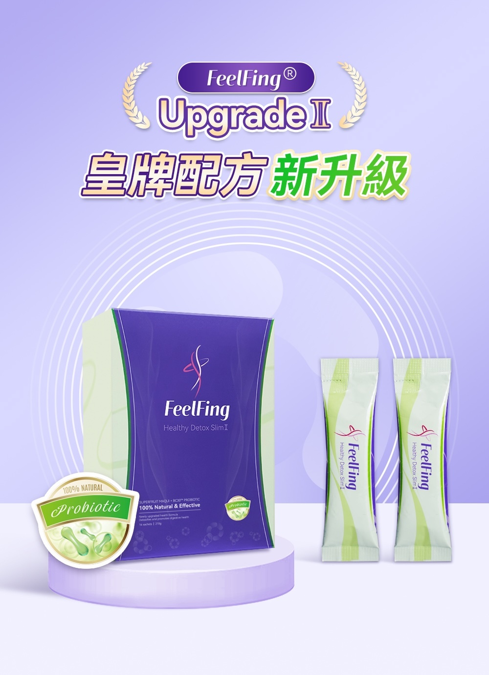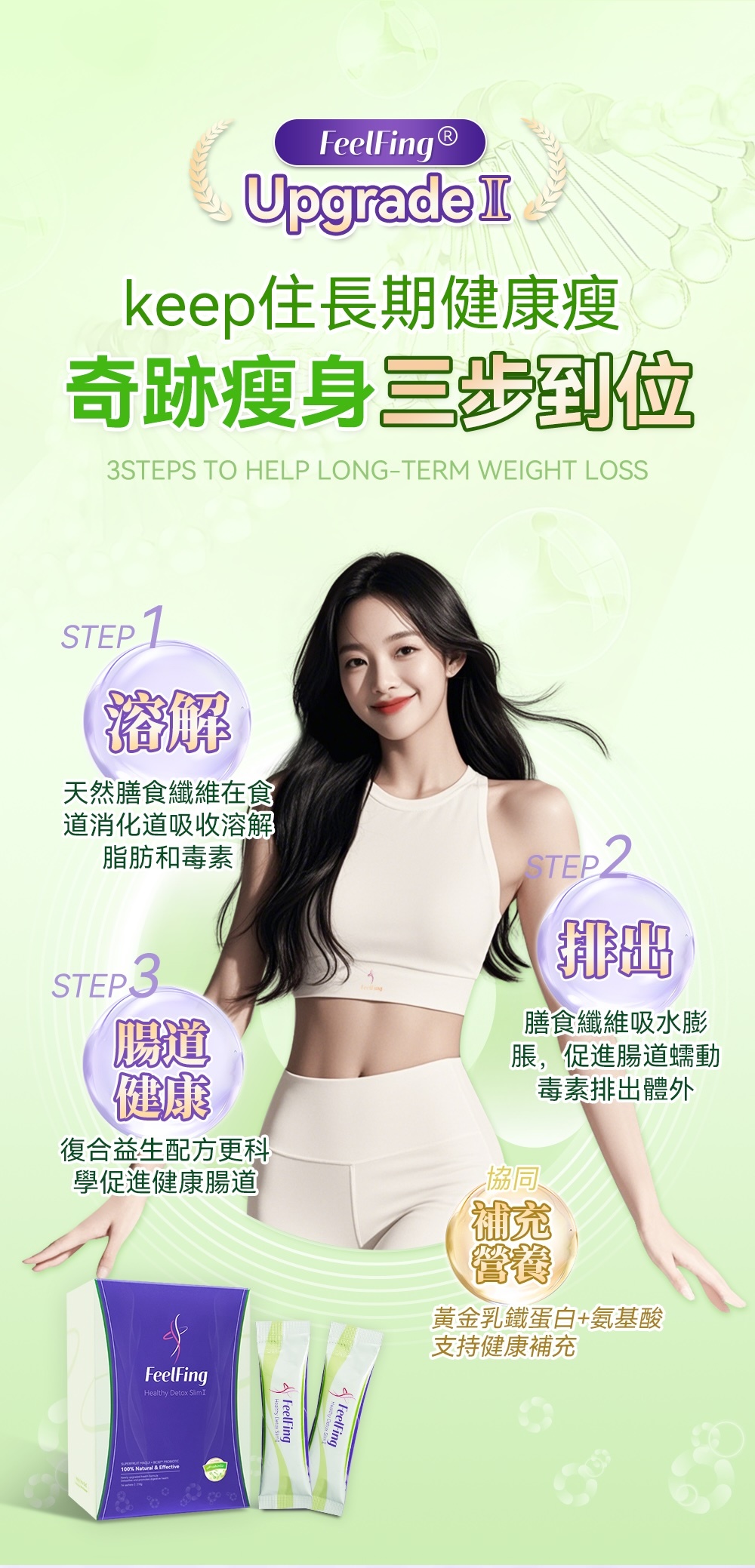 FeelFing皇牌刮油配方再升級「益生元纖體飲」,每日一杯落肚,邊排毒瘦身,邊健腸護胃!沿用一代有效成分,「復合莓果」有效排出體內的油脂和毒素,狠甩贅肉;「馬基莓」超強美顏抗氧化,天然口服的皮膚化妝品!重磅升級「復合益生元」配方,打造健康腸道,養成易瘦的體質,KO反彈!最佳健康搭檔「鐵蛋白+氨基酸」配方,保障我哋排便後的營養補充,免疫力提升plus!