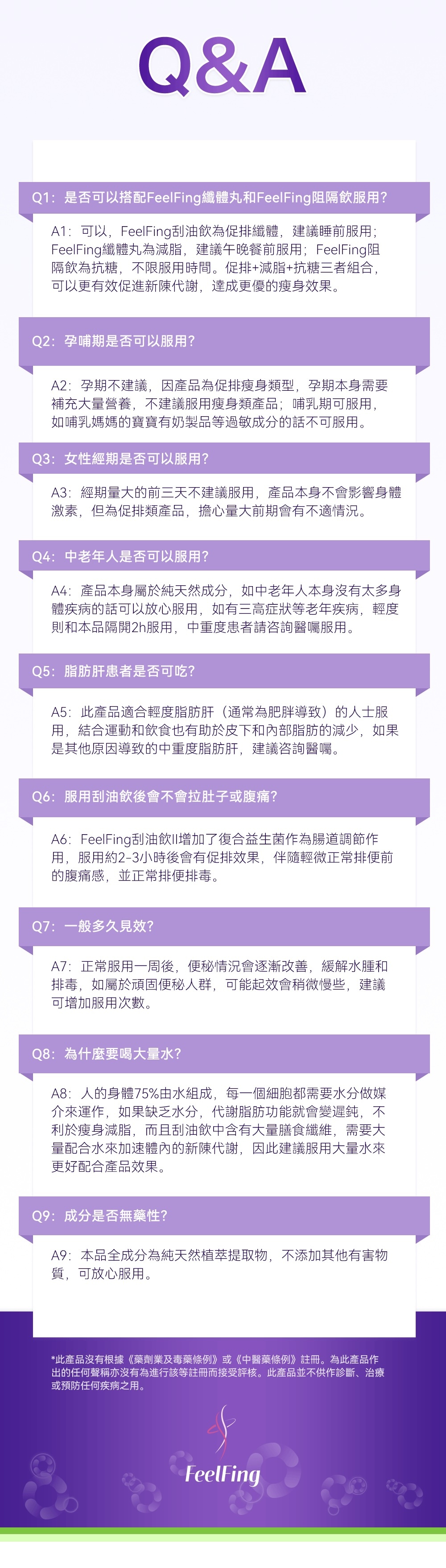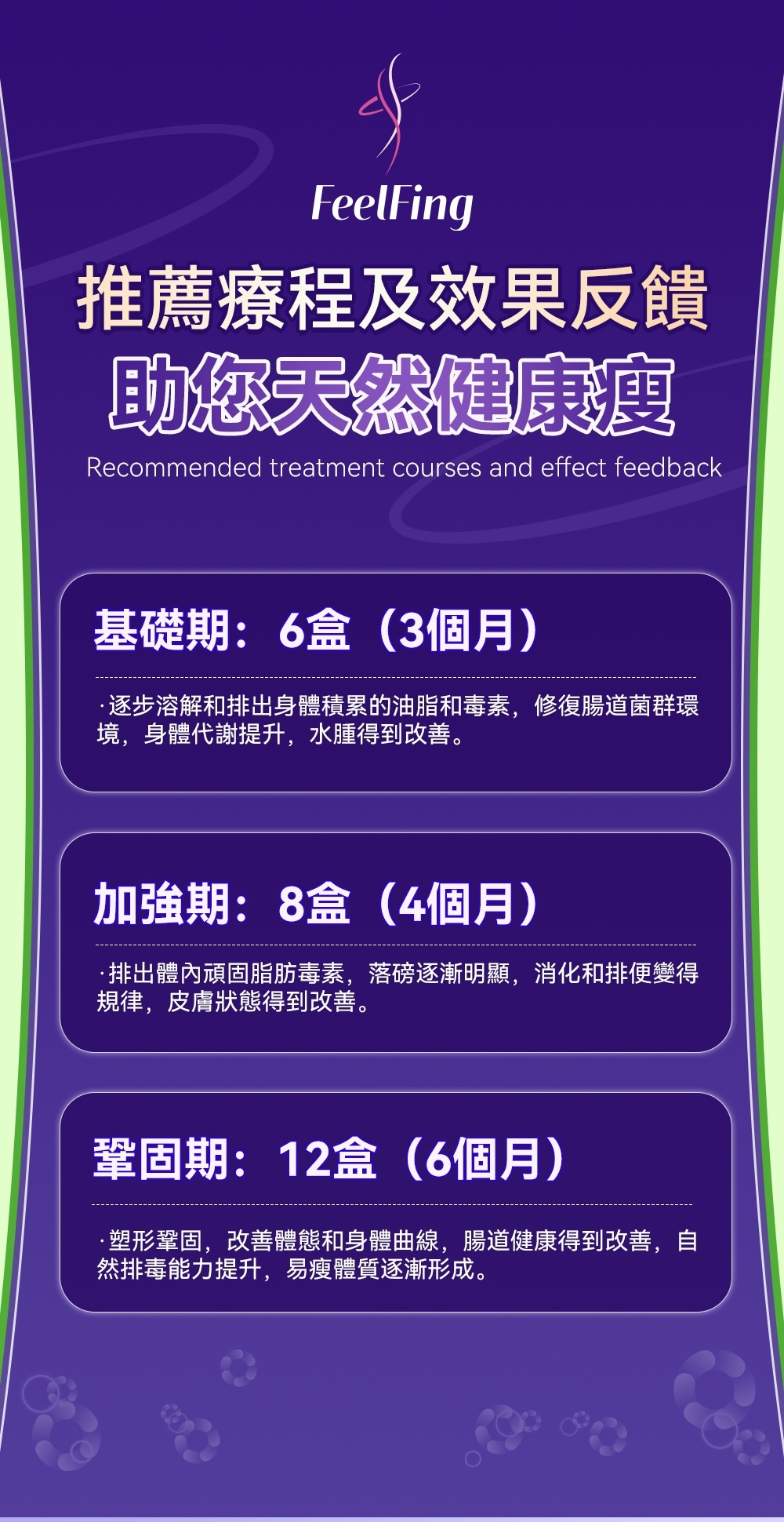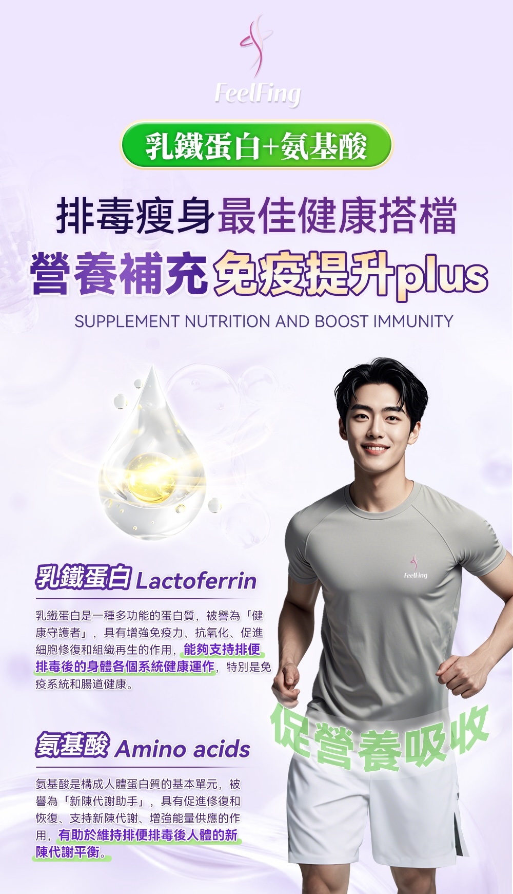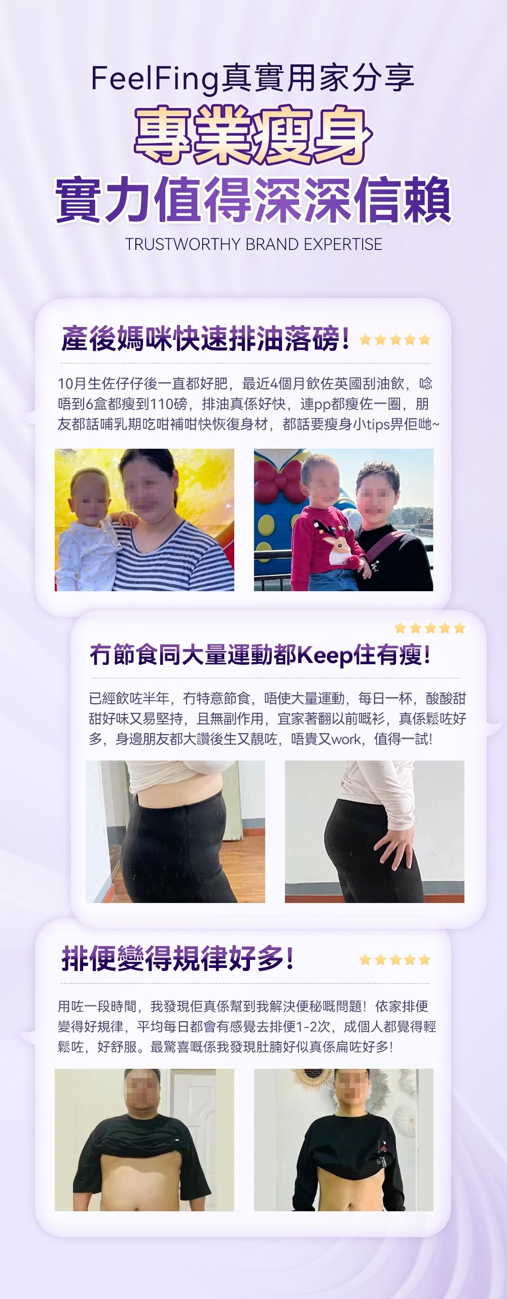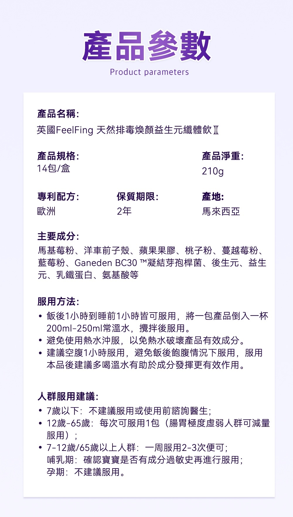 FeelFing皇牌刮油配方再升級「益生元纖體飲」,每日一杯落肚,邊排毒瘦身,邊健腸護胃!沿用一代有效成分,「復合莓果」有效排出體內的油脂和毒素,狠甩贅肉;「馬基莓」超強美顏抗氧化,天然口服的皮膚化妝品!重磅升級「復合益生元」配方,打造健康腸道,養成易瘦的體質,KO反彈!最佳健康搭檔「鐵蛋白+氨基酸」配方,保障我哋排便後的營養補充,免疫力提升plus!