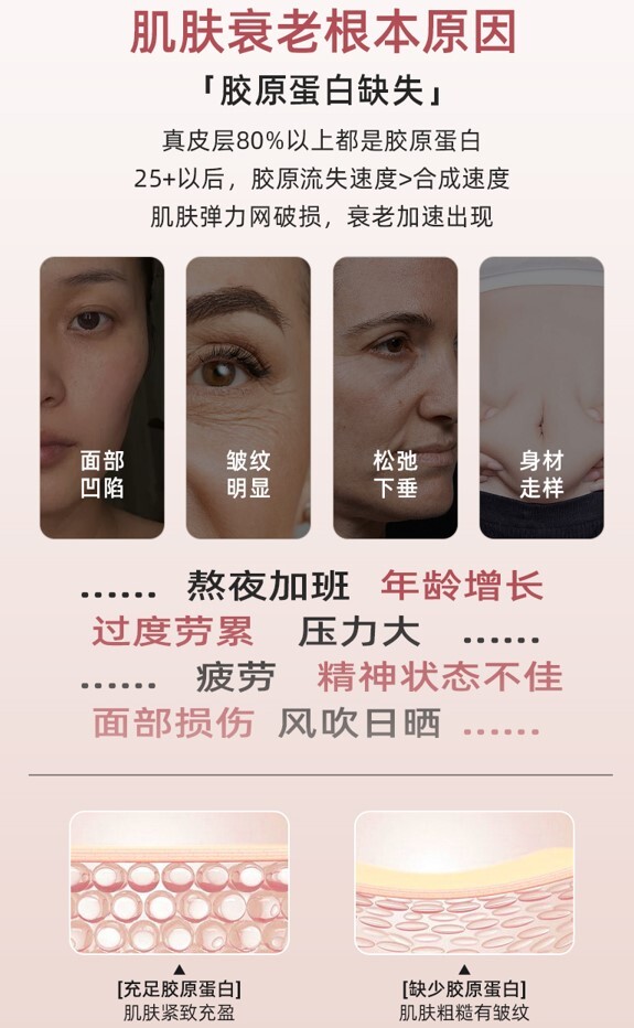 研究顯示,20歲後人體合成膠原蛋白的能力開始下滑,每年以1-1.5%的速度流失,導致肌膚支