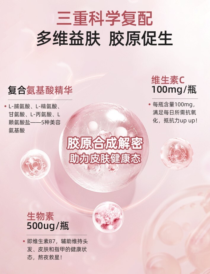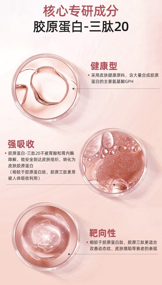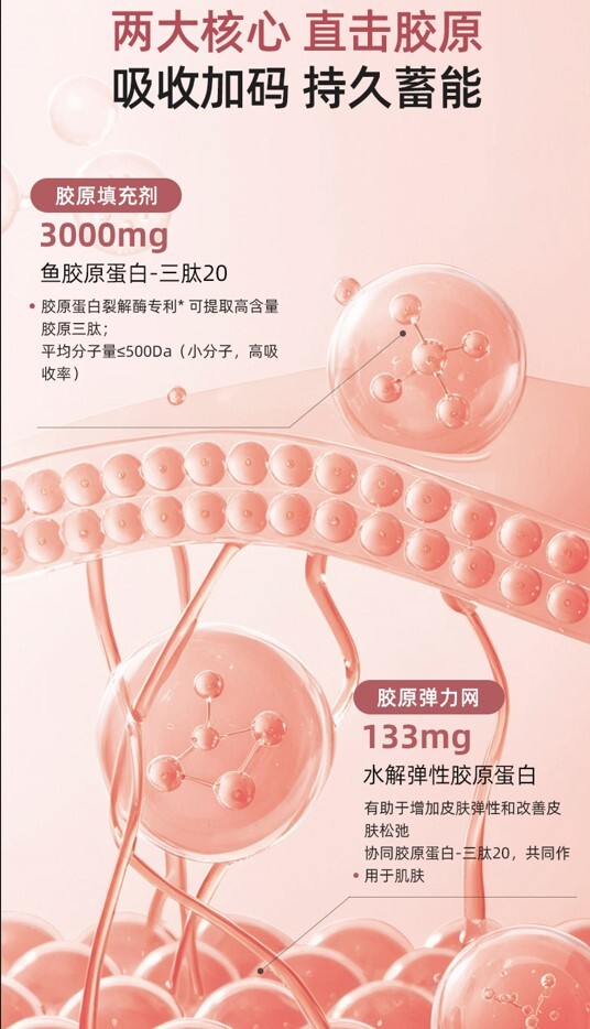 嚴選分子量僅500道爾頓的深海魚鱗膠原蛋白,搭配彈力蛋白與玻尿酸,