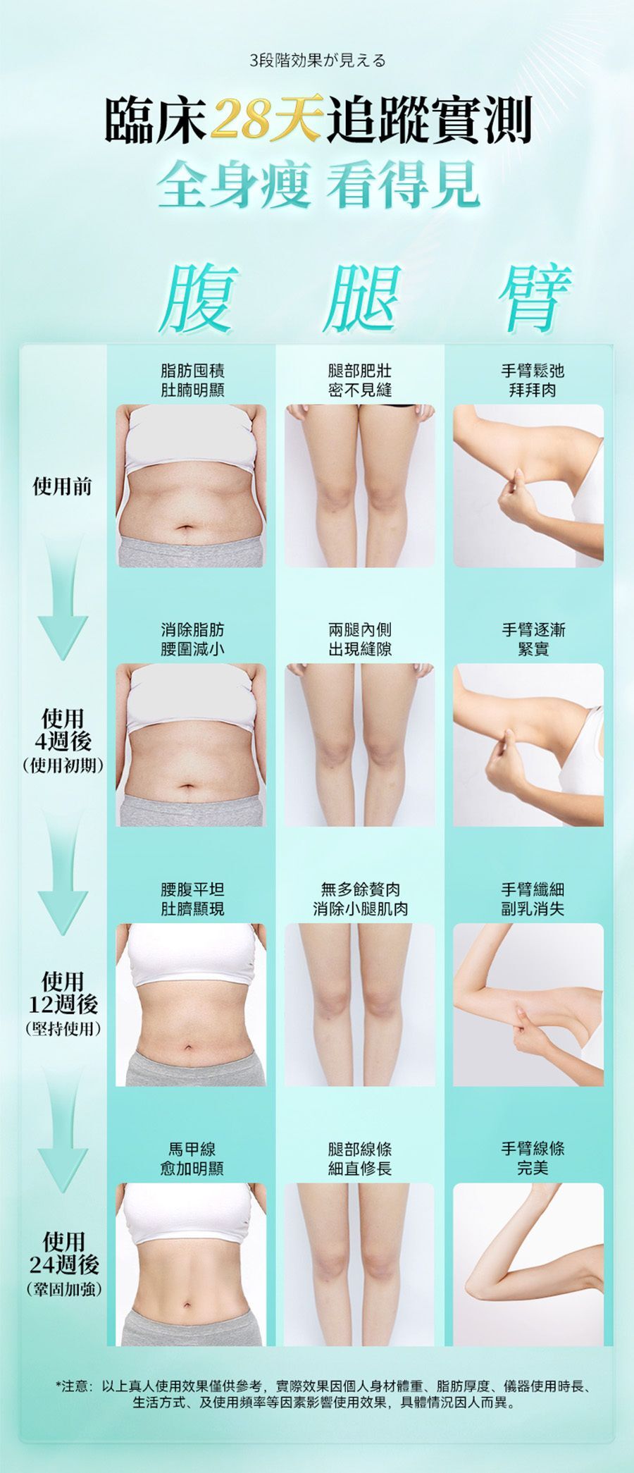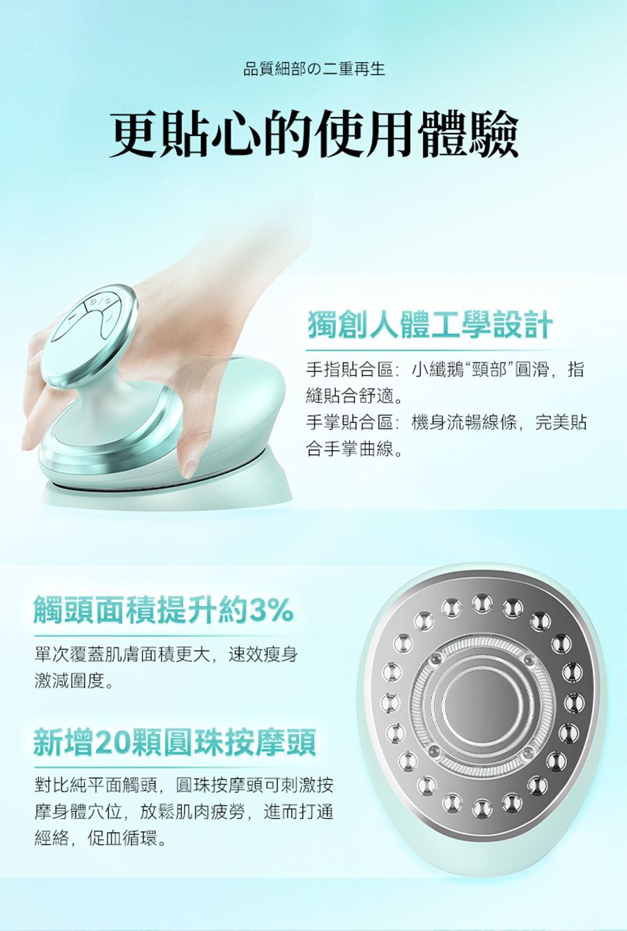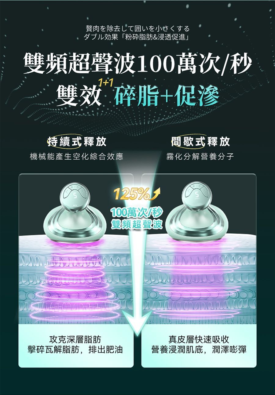 1.升級至100萬次/秒高頻超聲波,攻克瓦解頑固脂肪團,消除贅肉,降低圍度。