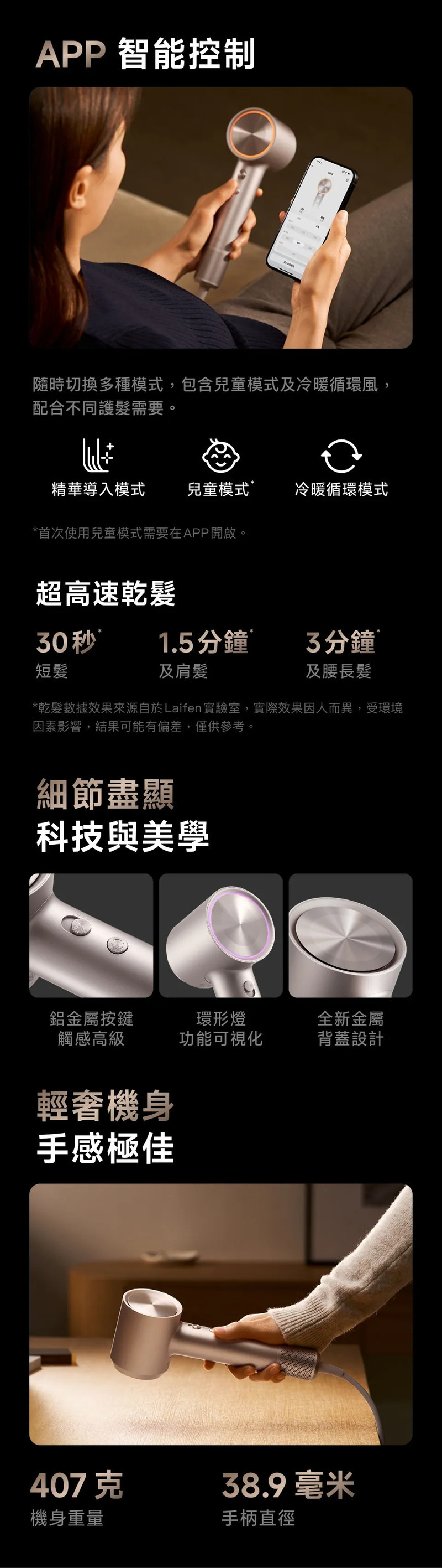 • 可連接智能APP,定制24種個人化吹髮組合,