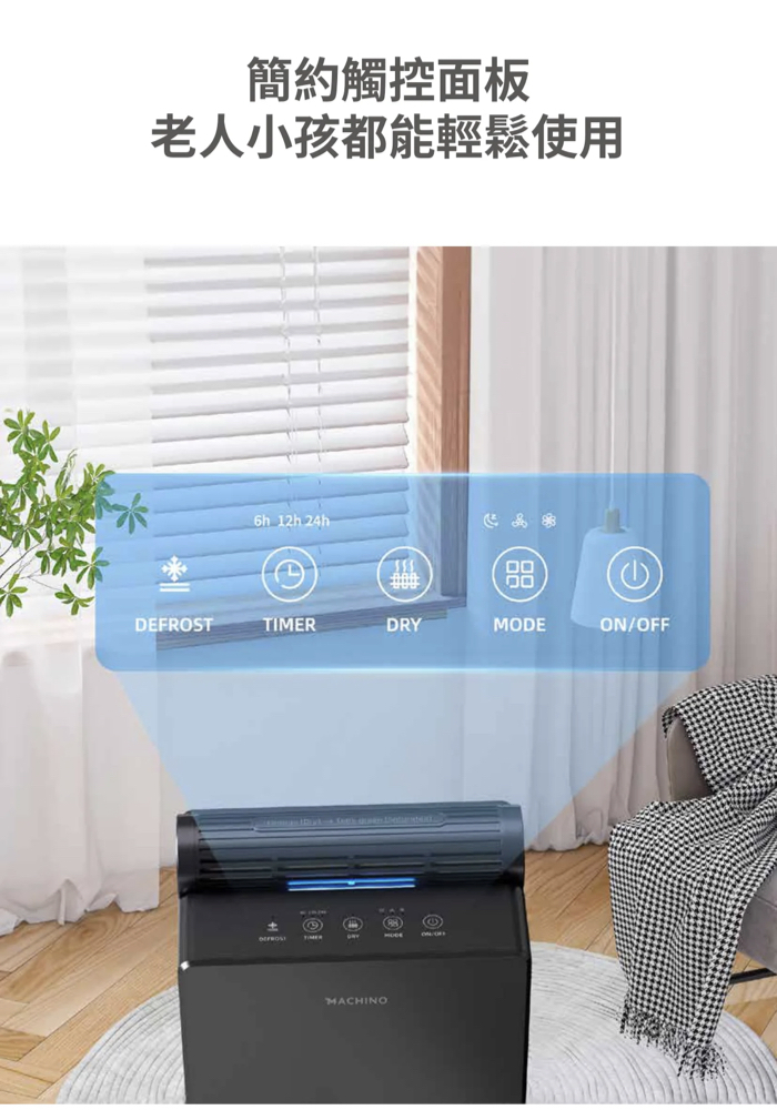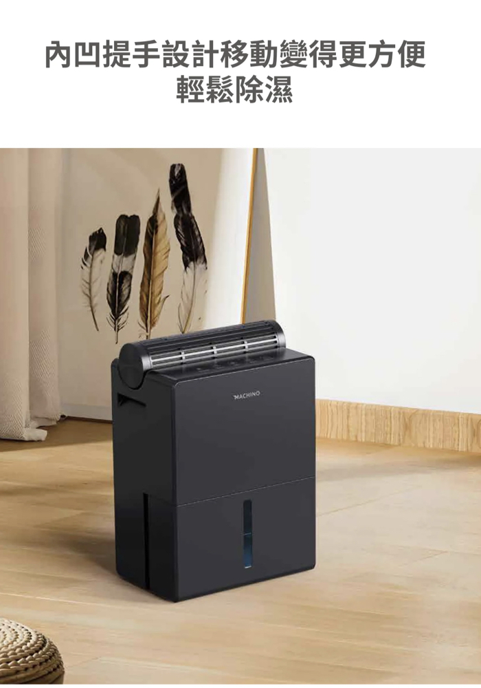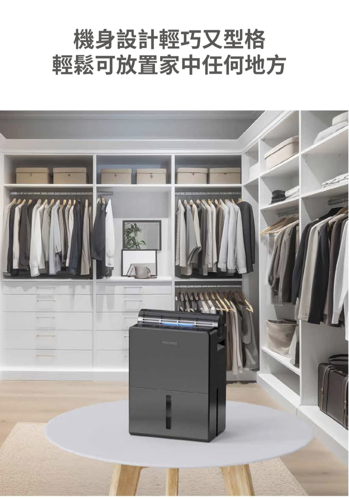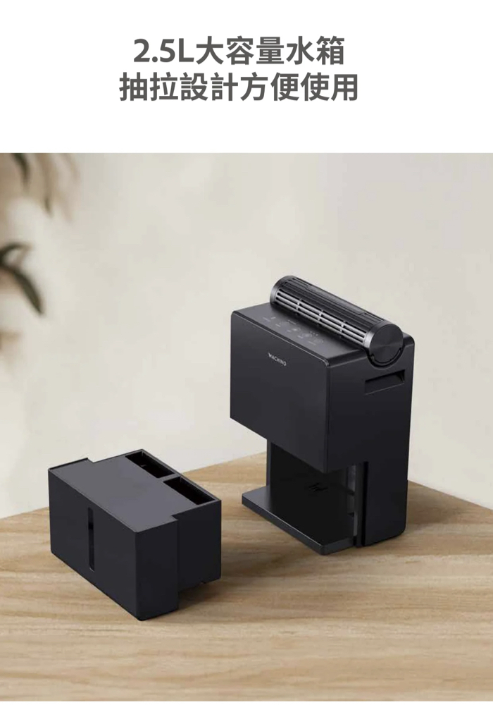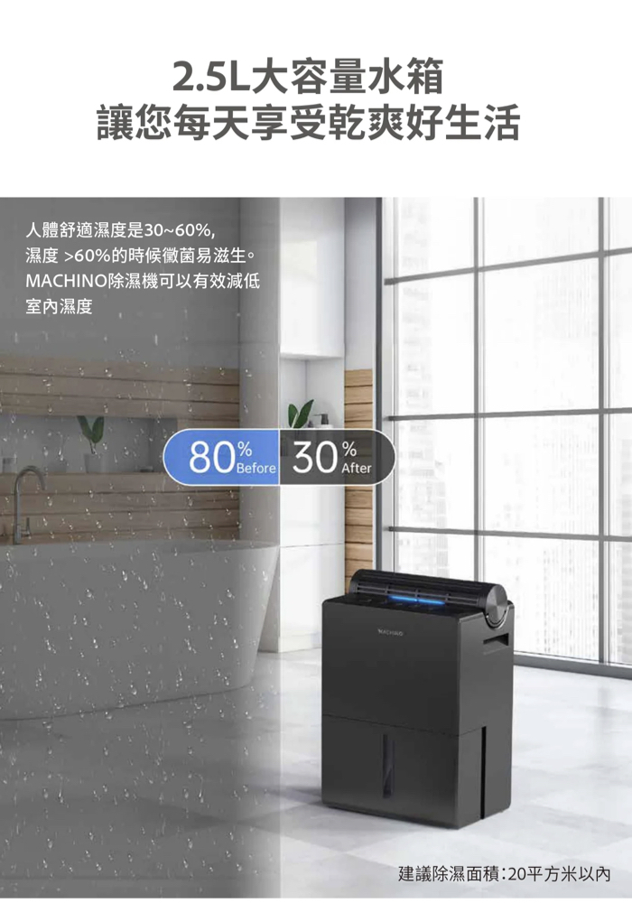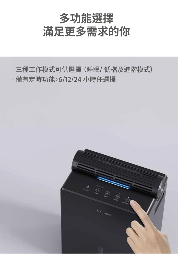 產品配備2.5L 大容量水箱除濕,有定時、睡眠模式、水滿提示、自動除霜等功能,