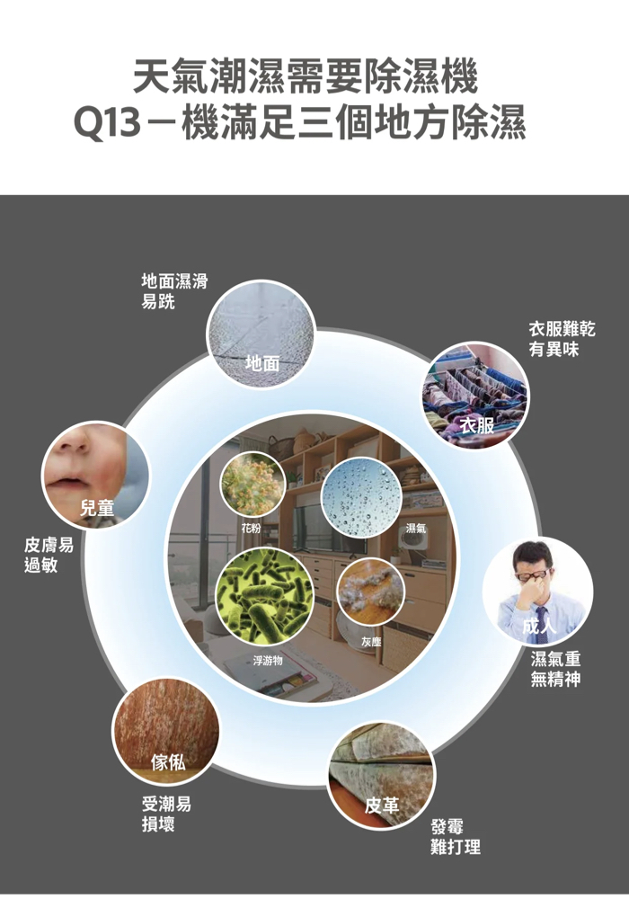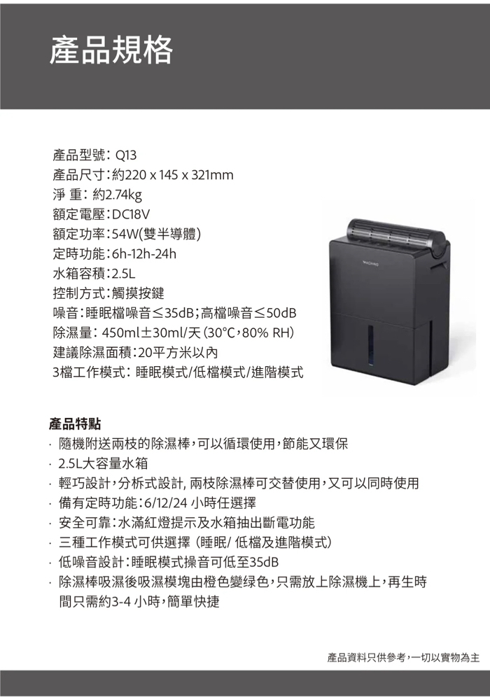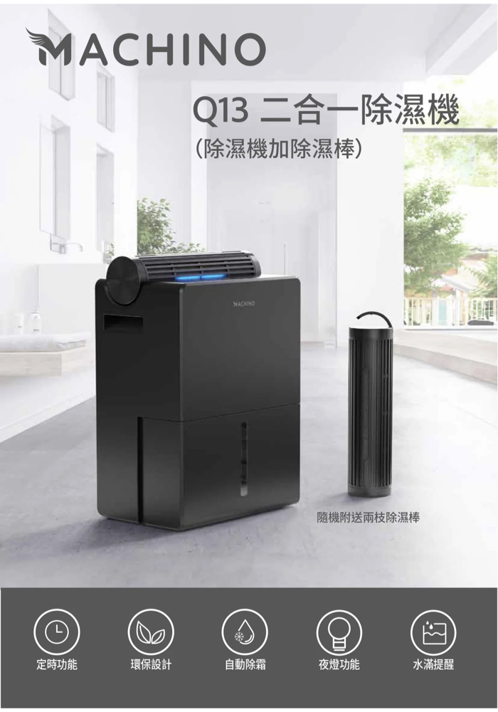 Machino Q13 二合一除濕機,機配備兩枝除濕棒,可同時為家中三個地方除濕。