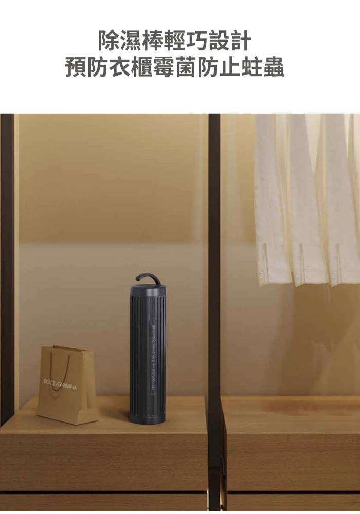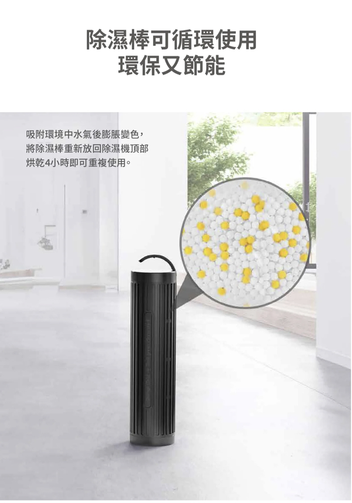 機身設計輕巧又型格,隨機附送兩枝可循環使用的除濕棒,節能又環保,