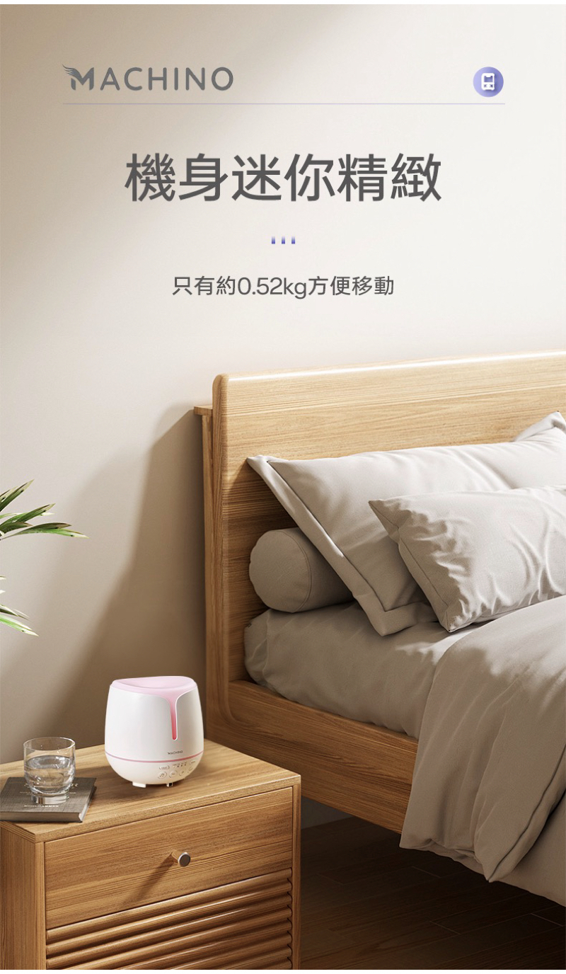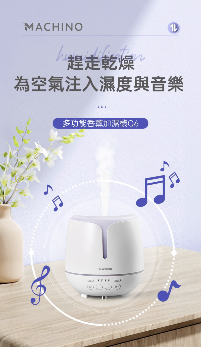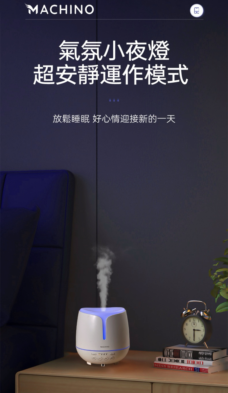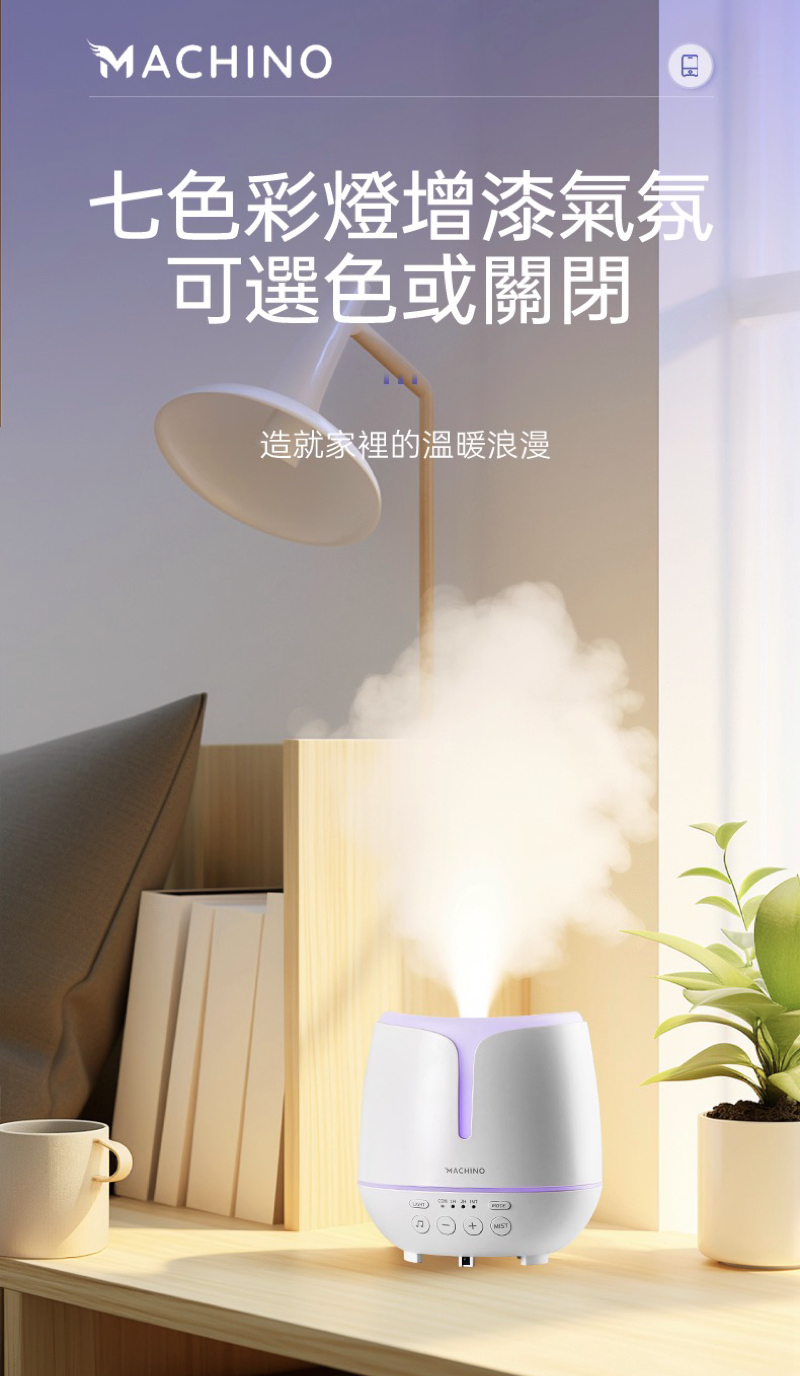 Machino 新出Q6多功能香薰加濕機,除了加濕外,附有七彩燈光效果,增添氛圍。