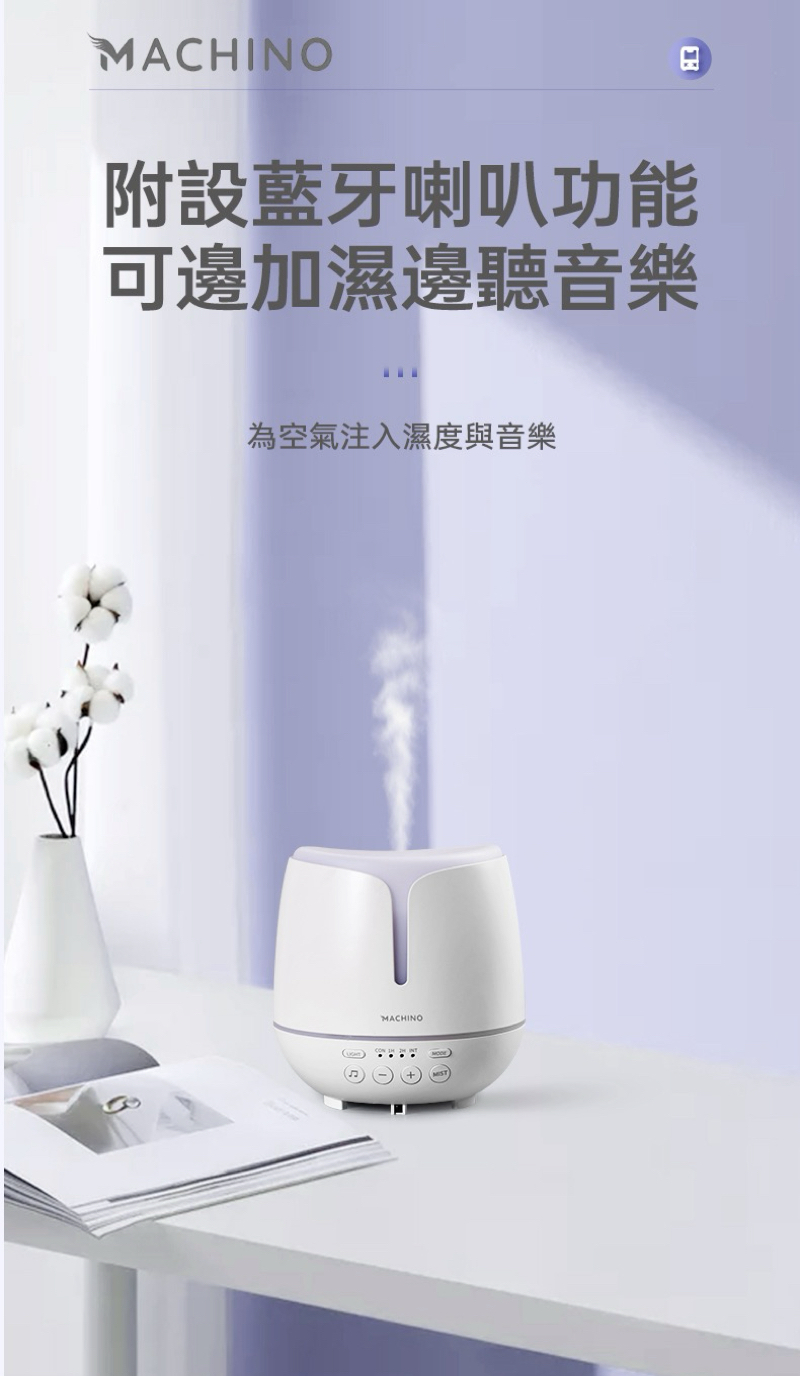 另設藍牙喇叭功能,讓您享受加濕、音樂的同步進行,夜晚放屋內,