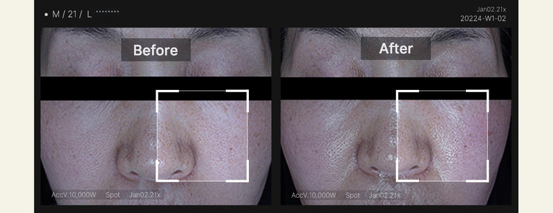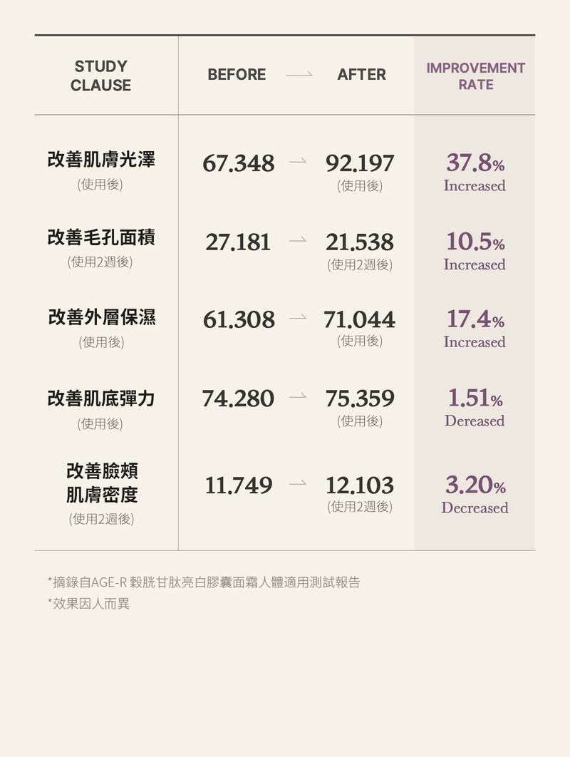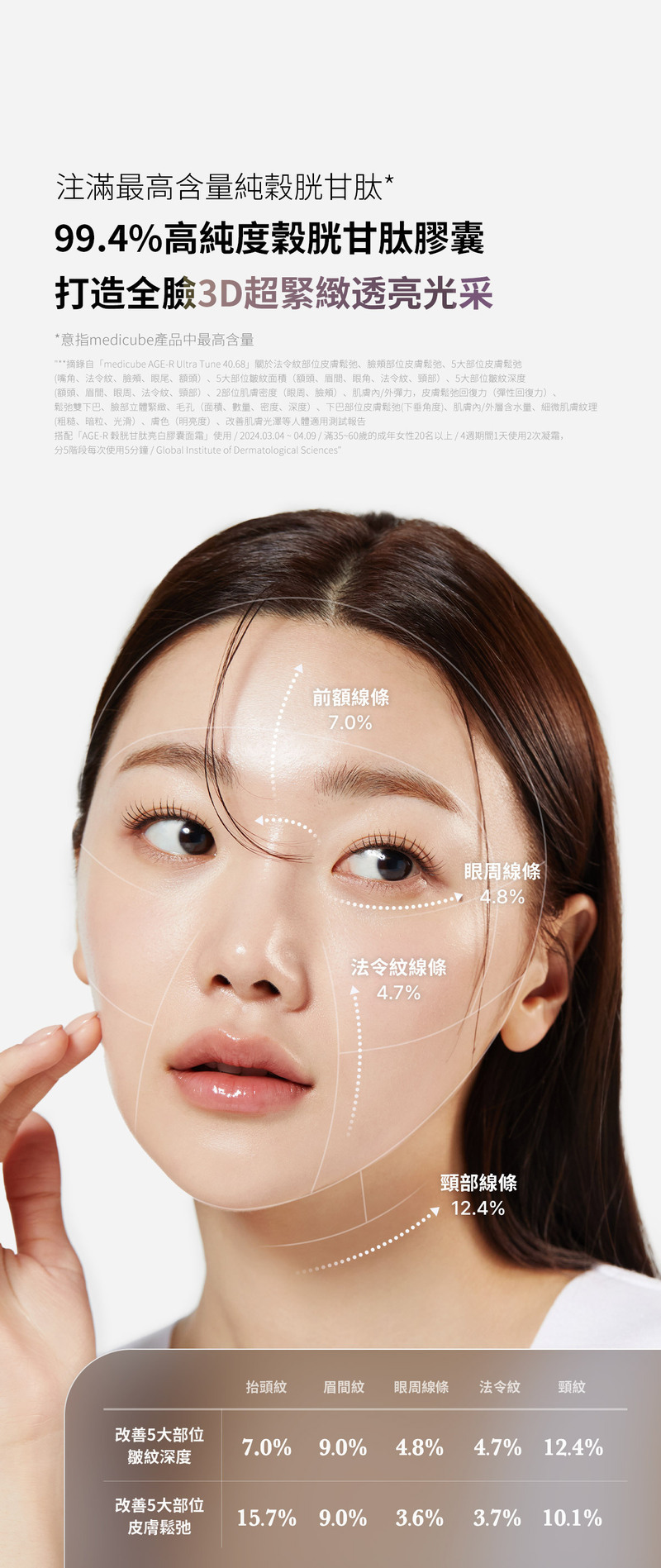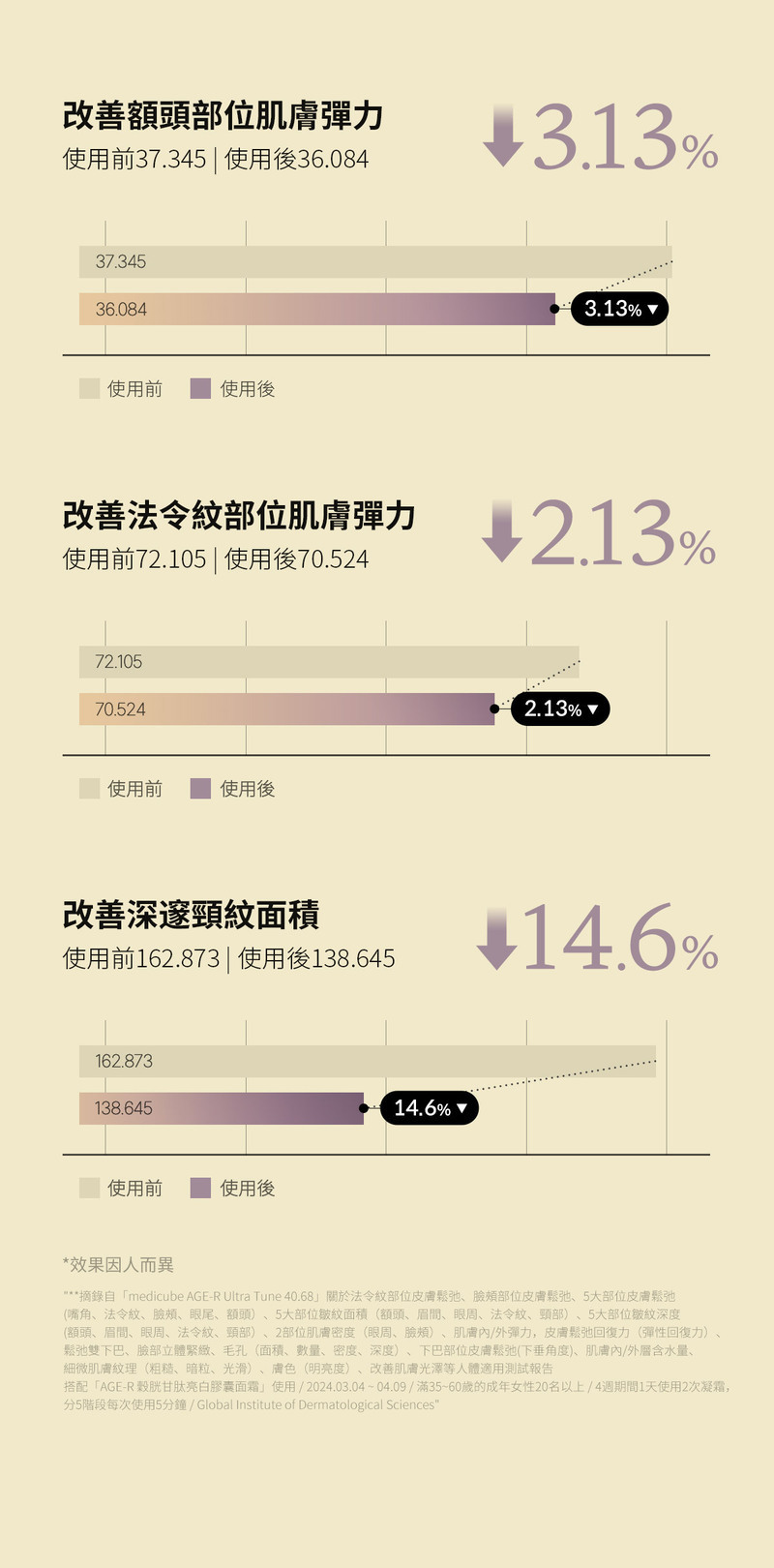 臉頰肌膚密度:提高3.2%。額頭下垂:減少3.13%。