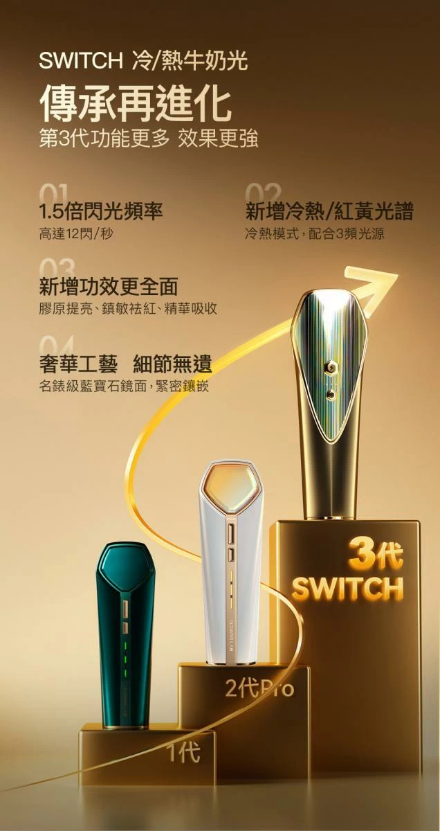 延續前兩代高效美白袪斑、不反黑的優點,第三代加入深紅光及黃光,