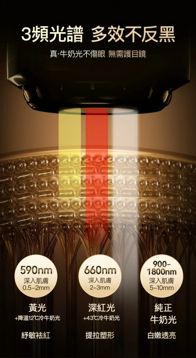 1. 沿用900-1800nm精選牛奶光段,新增660nm膠原深紅光及590nm紓緩黃光,