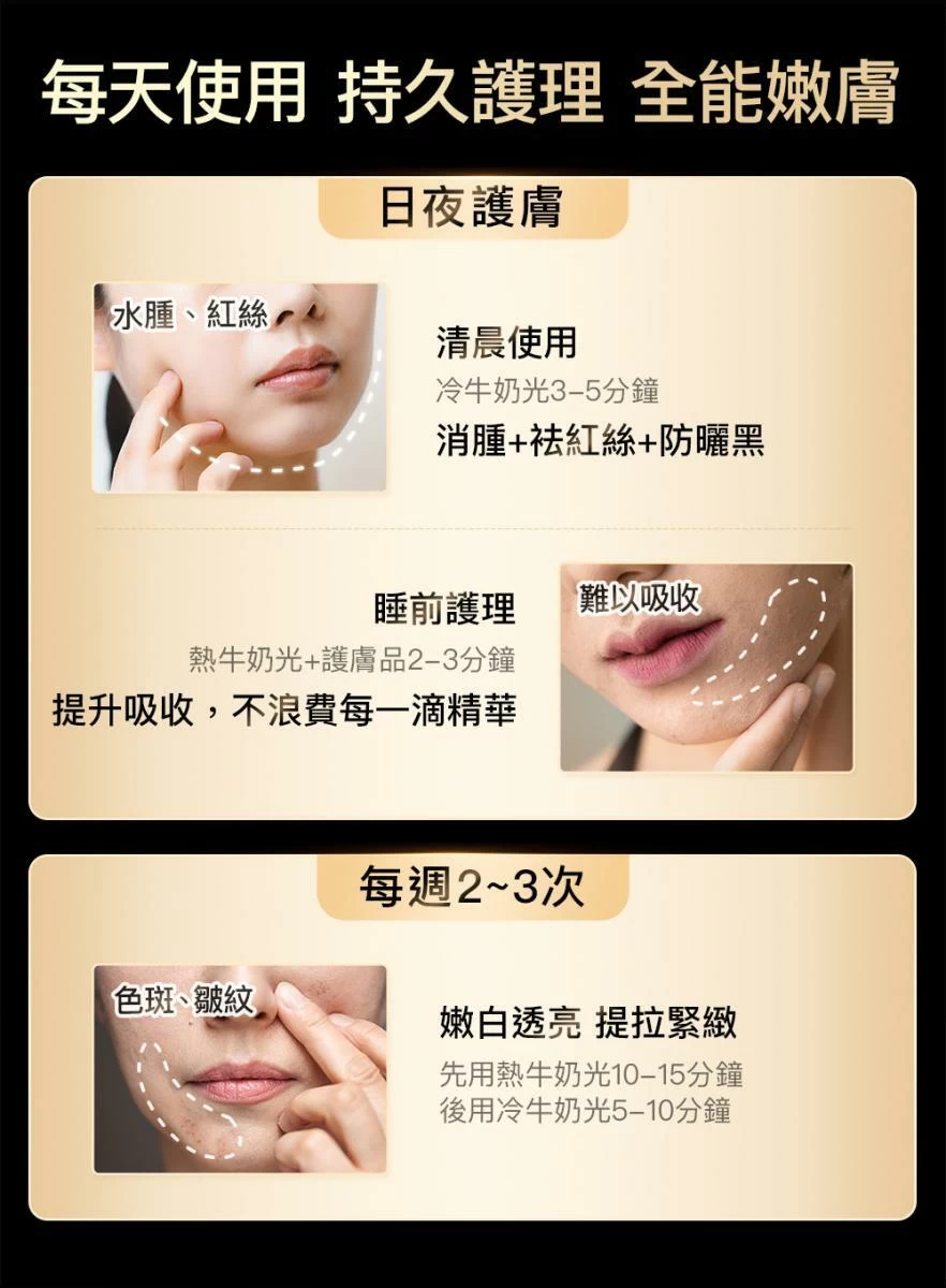 ✨冷牛奶光(12度)配合黃光:舒緩敏感肌膚,減淡紅血絲,收毛孔,減水腫(適合早上每天使用)