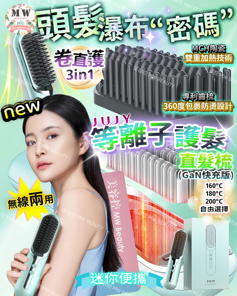 2.產品名稱:日本JUJY PlasmaCare護髮雙效等離子充插兩用速熱防燙百變造型無線直髮梳(GaN快充版)