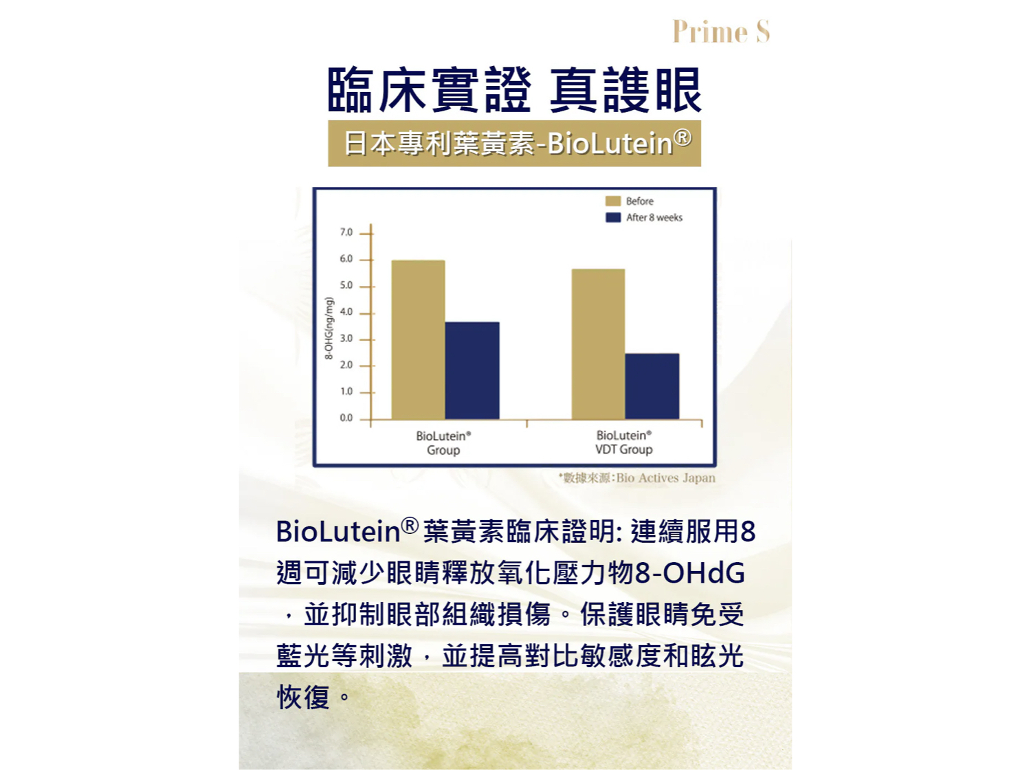 採用的BioLutein®葉黃素在臨床證明 : 可減少眼睛釋放氧化壓力物質8-OHdG。類胡蘿蔔素已知可以吸收紫外線和藍光