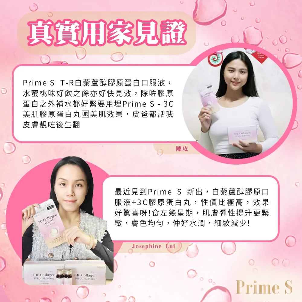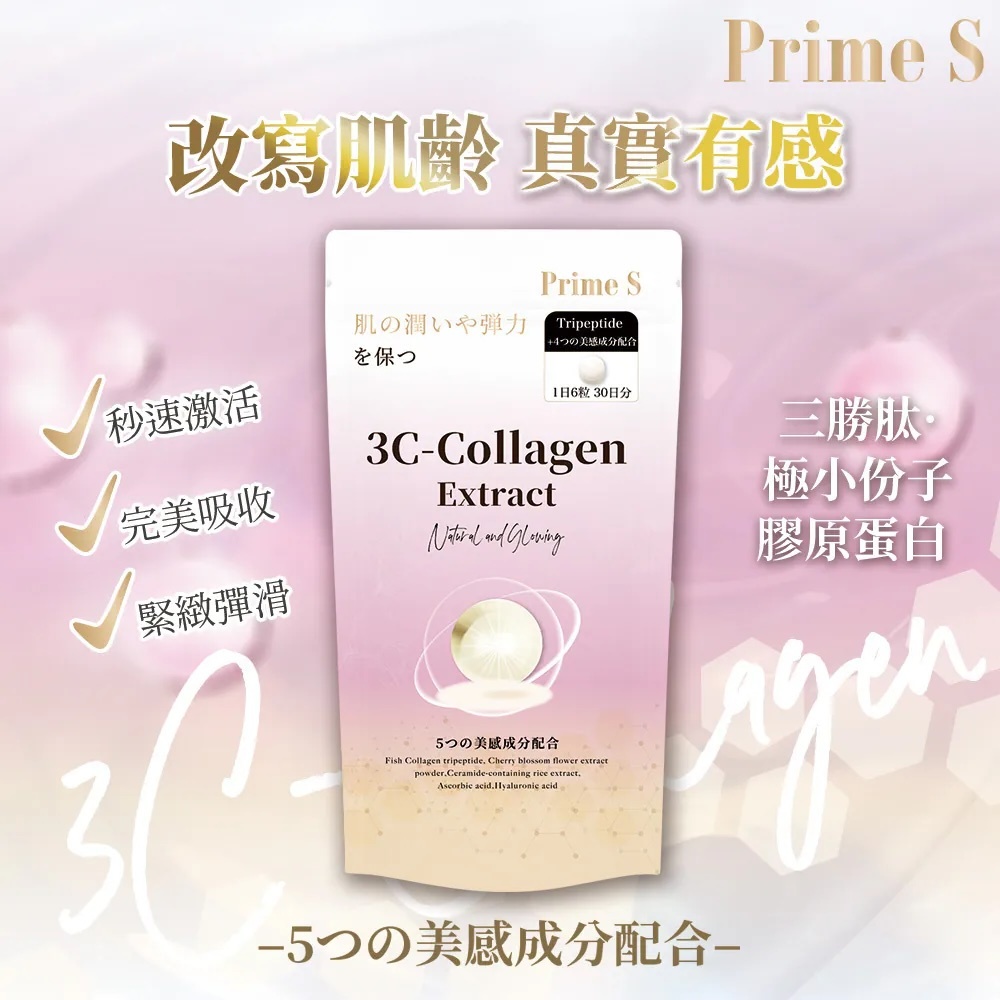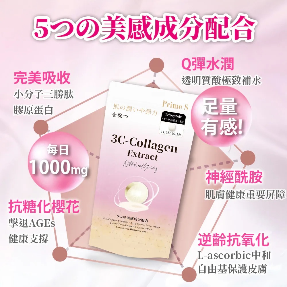 🔺5種美感成分配合:3C分別是三勝肽膠原蛋白(Collagen)、櫻花萃取(Cherry Blossom extract)、神經醯胺(Ceramide)、維他命C和透明質酸