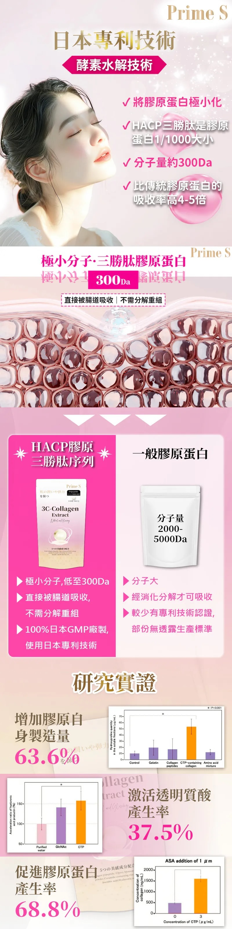 🔺獨特HACP三勝肽分子量僅膠原蛋白千分之一,低至300Da