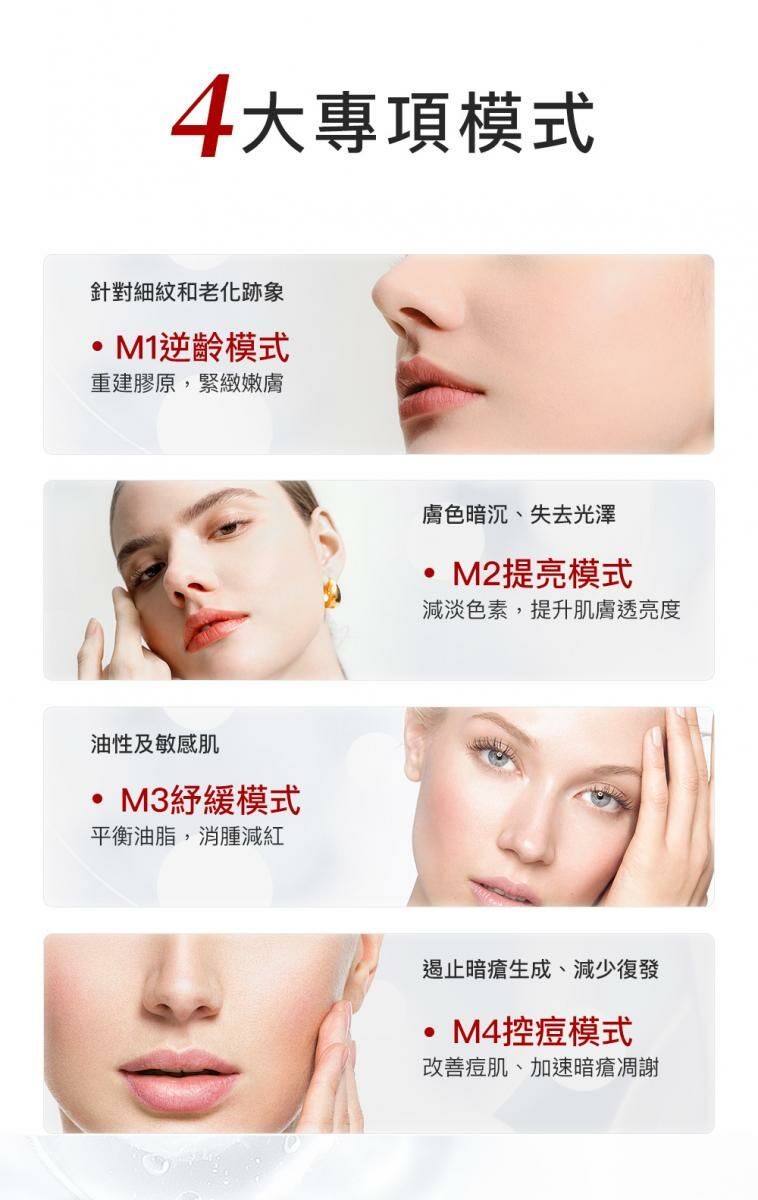 • 控痘模式︰適合暗瘡皮膚,加速消退痤瘡紅腫,使膚色更加均勻。