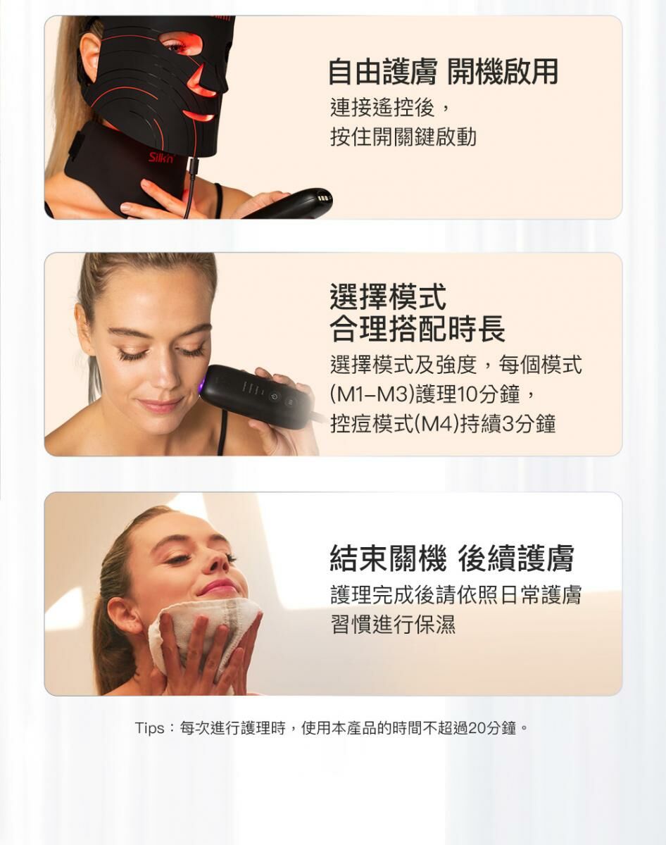 普通面膜儀為單一光源,只能進行專一護理,而Silk'n面膜頸膜美容儀紅光、深紅光、近紅外光科學搭配形成組合光源,將美白抗老功效發揮至最大化。產品分為面部、頸部、手提遙控三部份,可以結合使用達致全面逆齡!