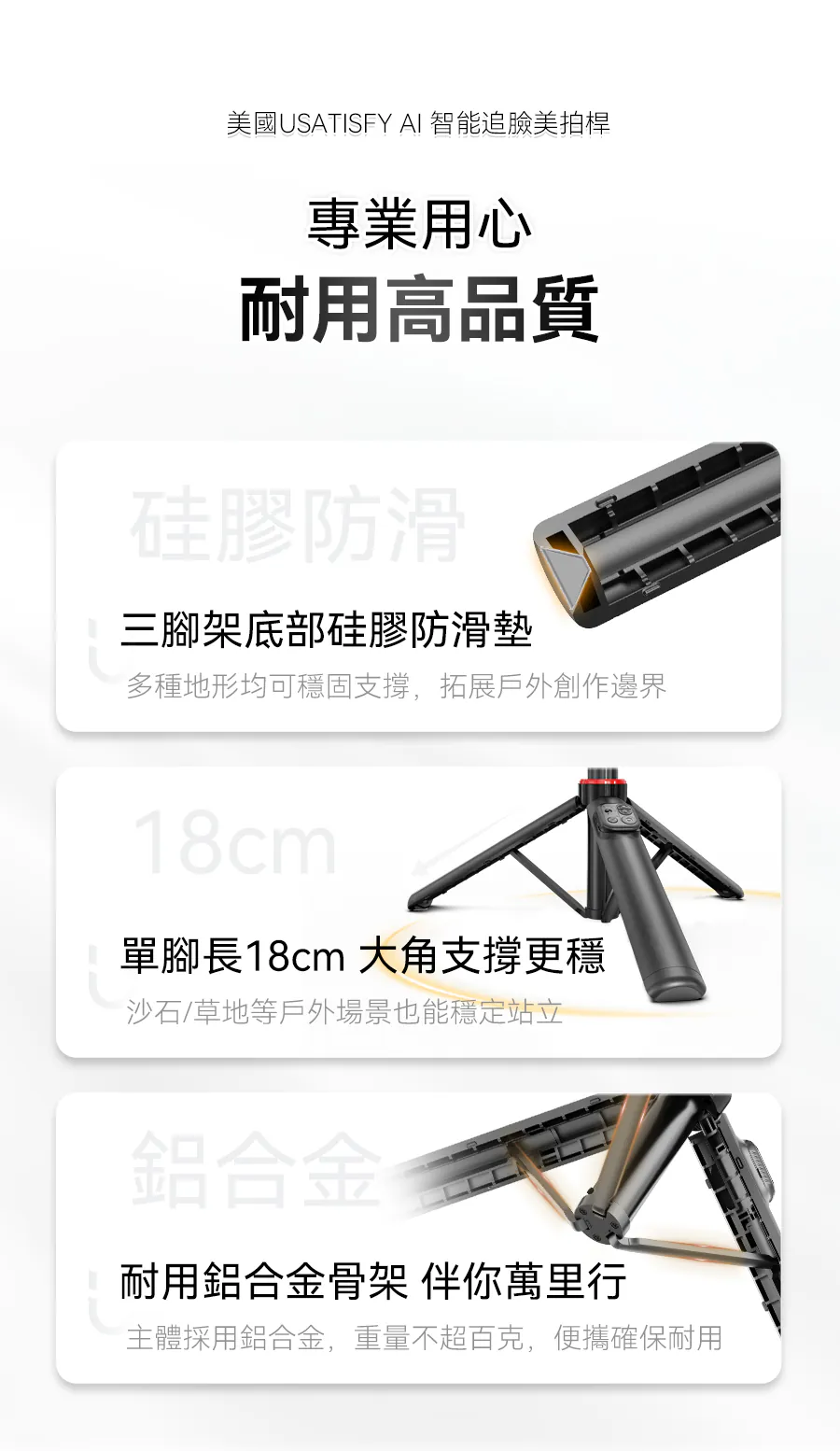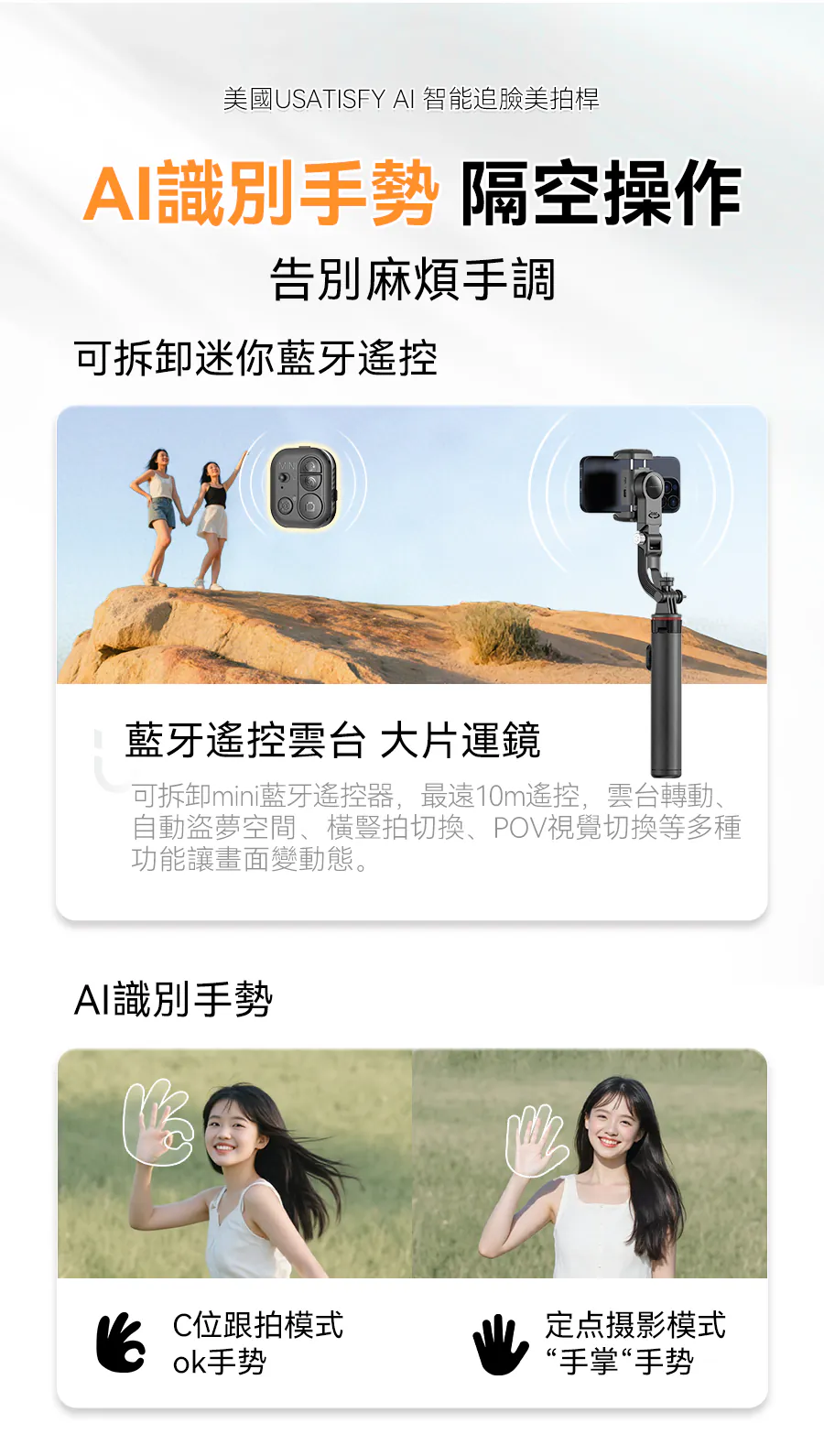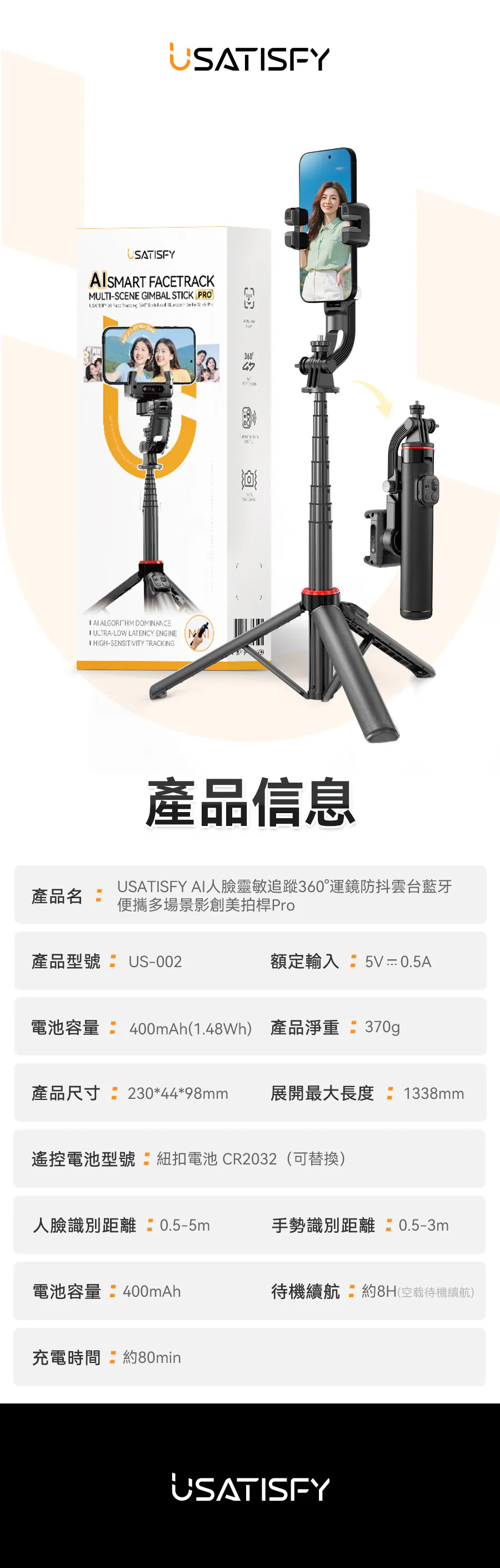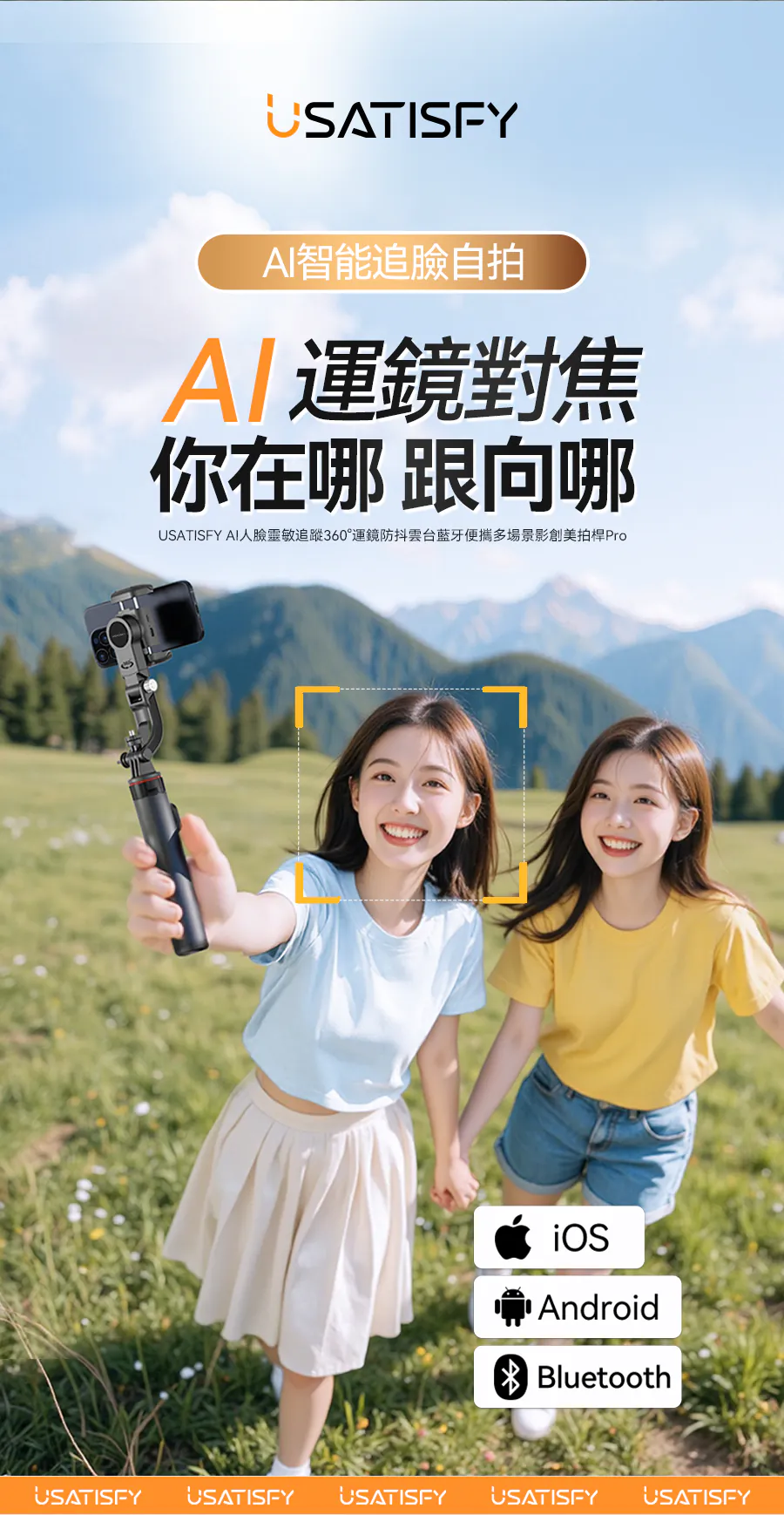 2.產品名稱:美國USATISFY AI人臉靈敏追蹤360°運鏡防抖雲台藍牙便攜多場景影創美拍桿Pro