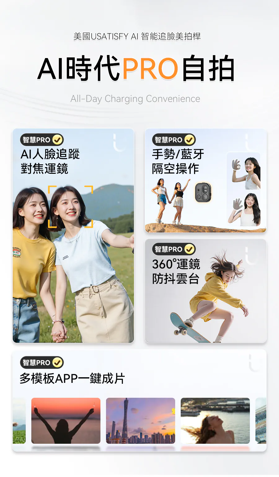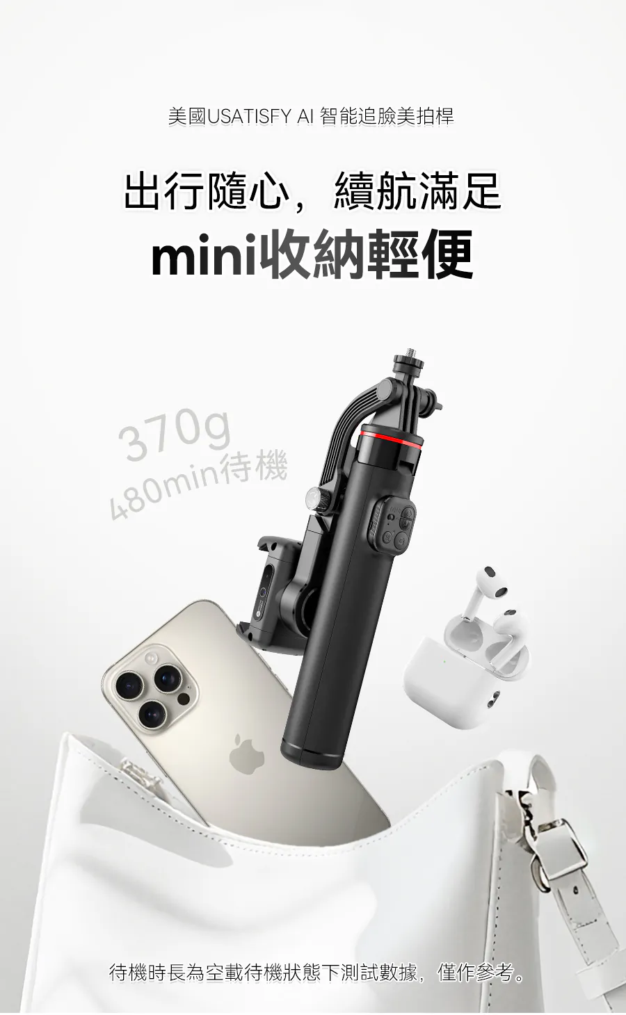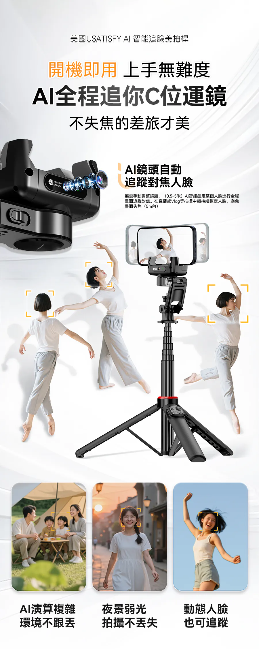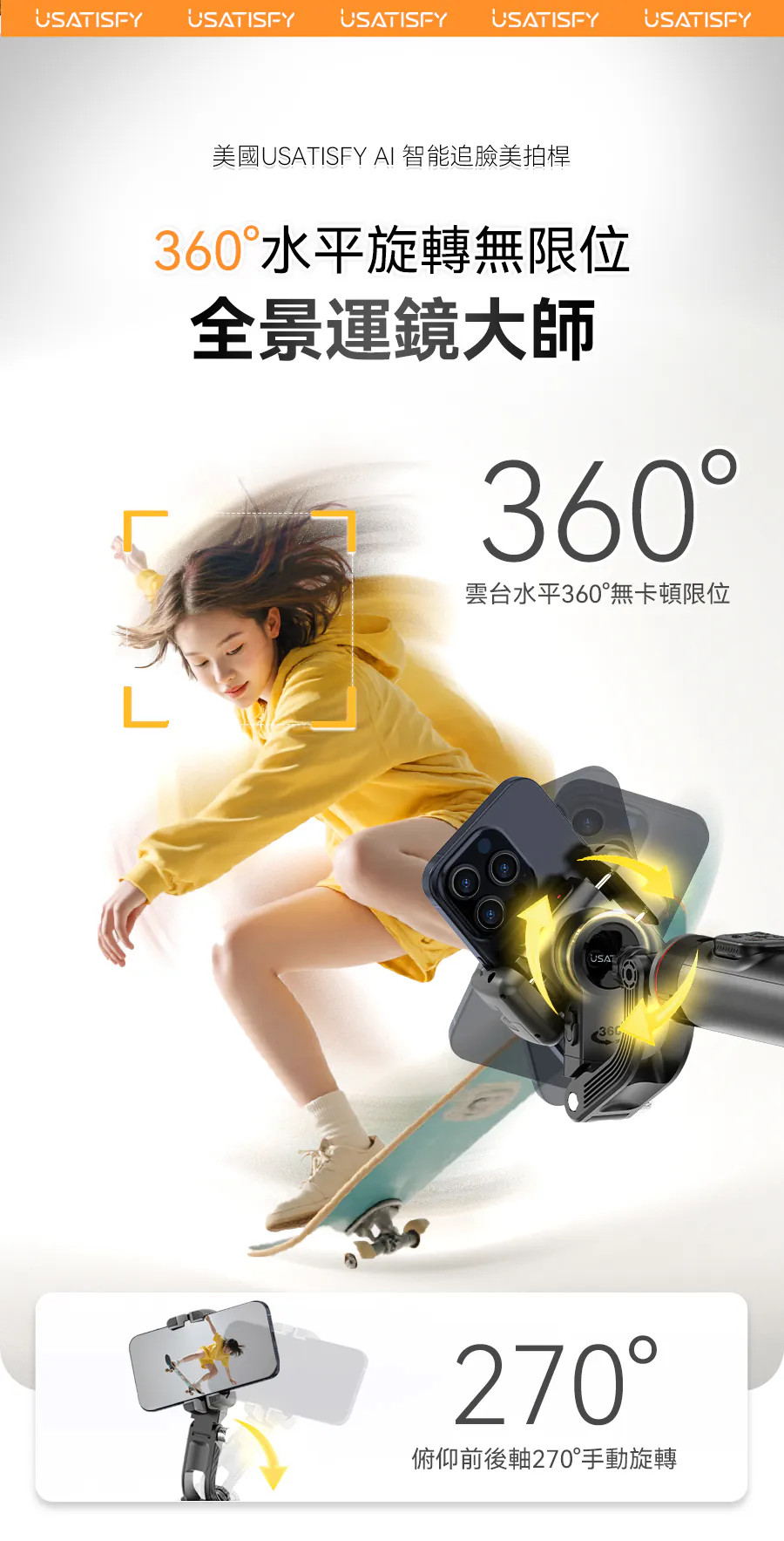 2.產品名稱:美國USATISFY AI人臉靈敏追蹤360°運鏡防抖雲台藍牙便攜多場景影創美拍桿Pro