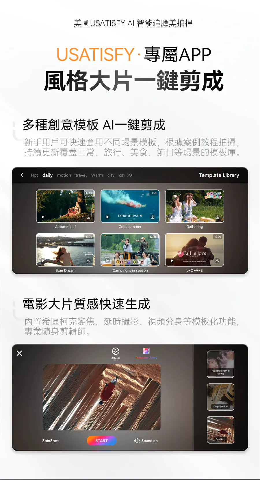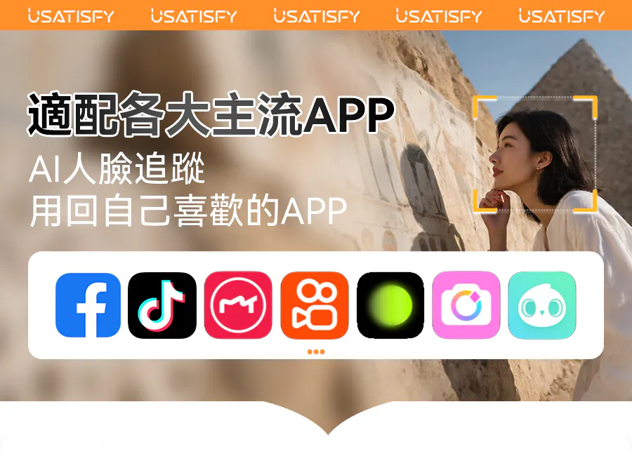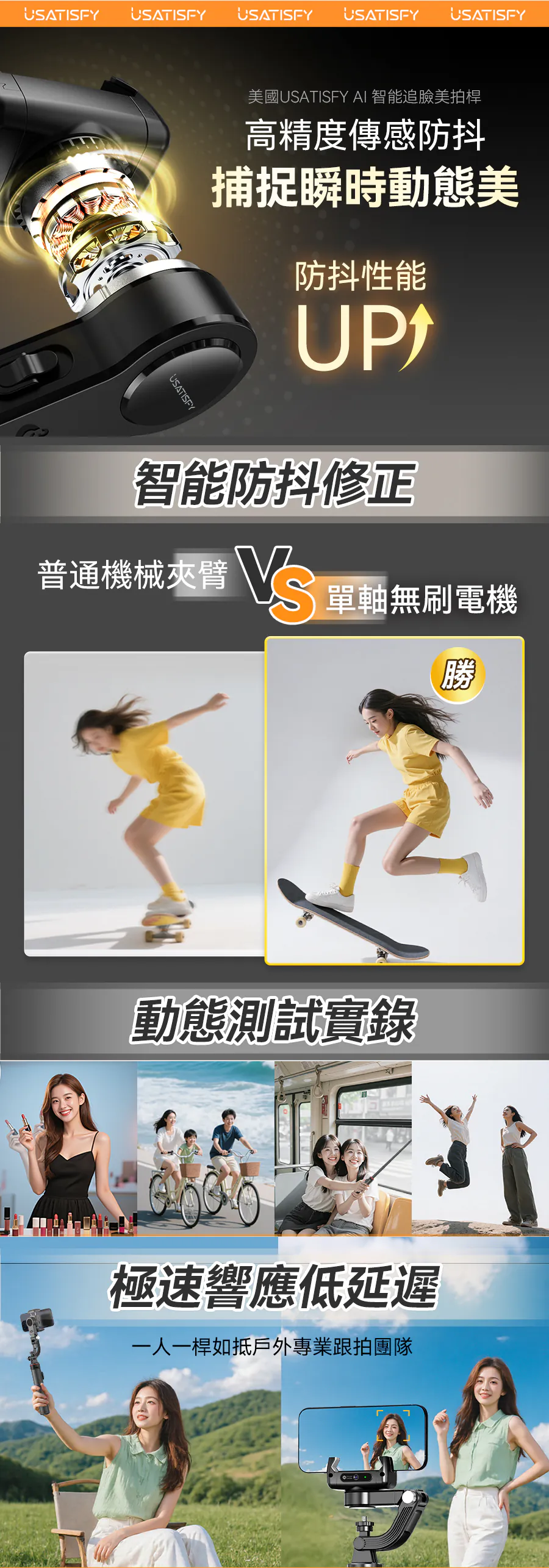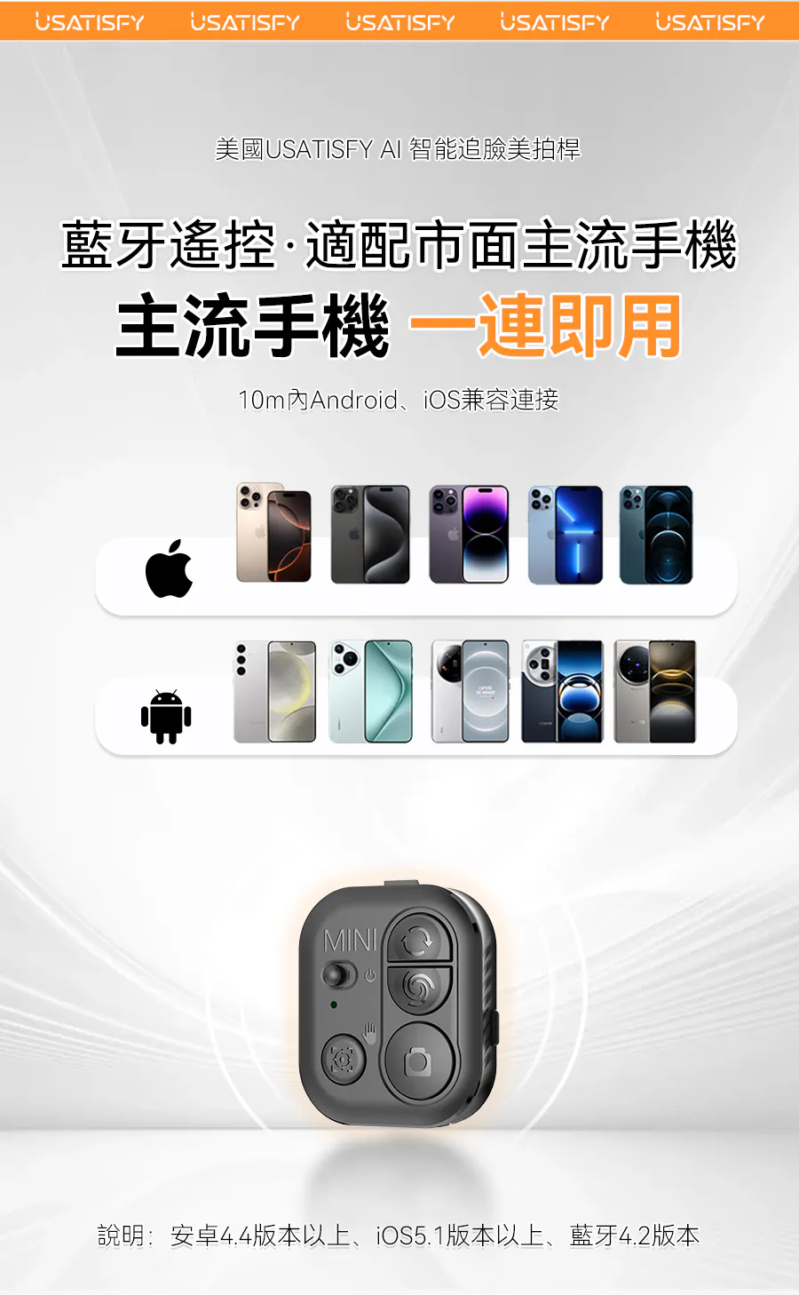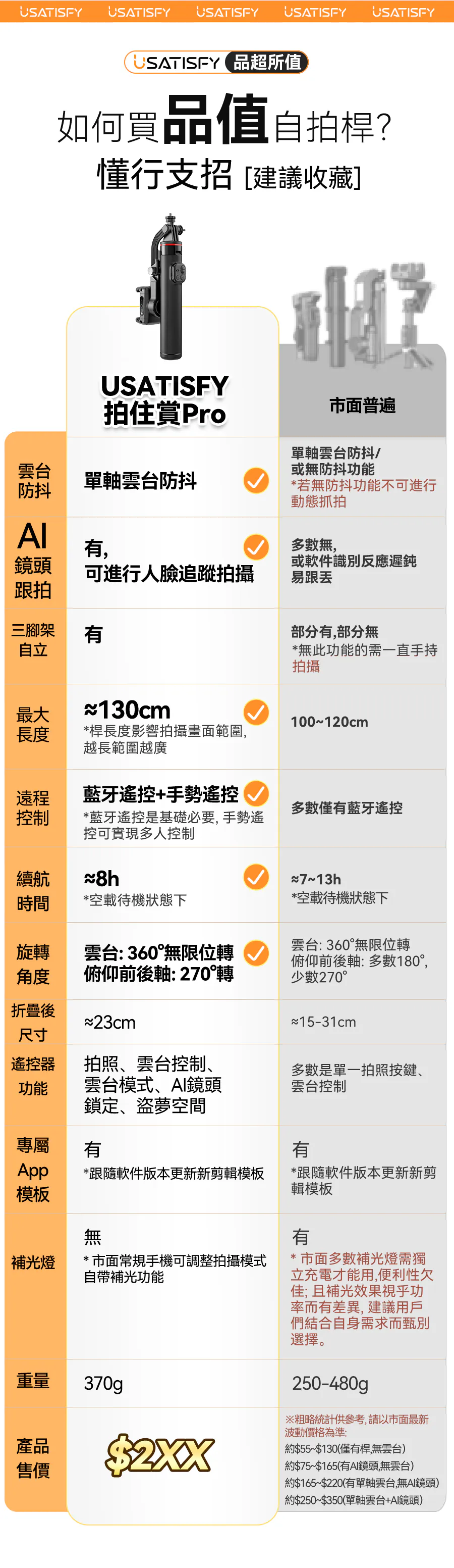 2.產品名稱:美國USATISFY AI人臉靈敏追蹤360°運鏡防抖雲台藍牙便攜多場景影創美拍桿Pro