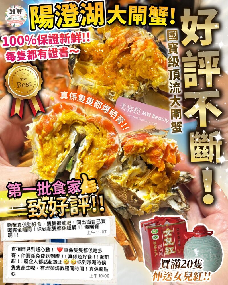 🔥訂購滿20隻大閘蟹送女兒紅一支價值$88/支 (只限單一訂單同一時間收貨地址) 🔥保證鮮活‼️有壞包換‼️